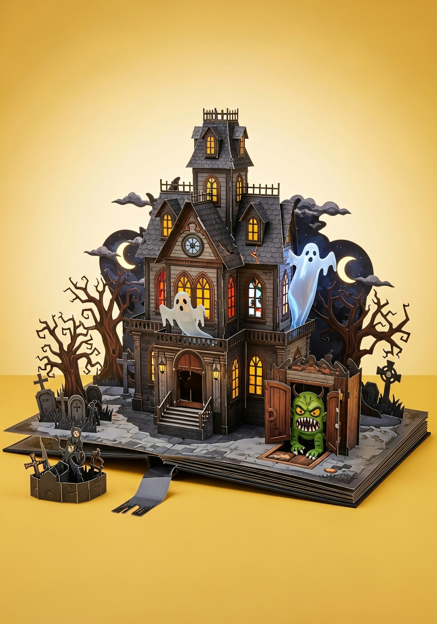 A vibrant pop-up haunted house with glowing windows, ghosts, and a green monster, set against a bright yellow background.