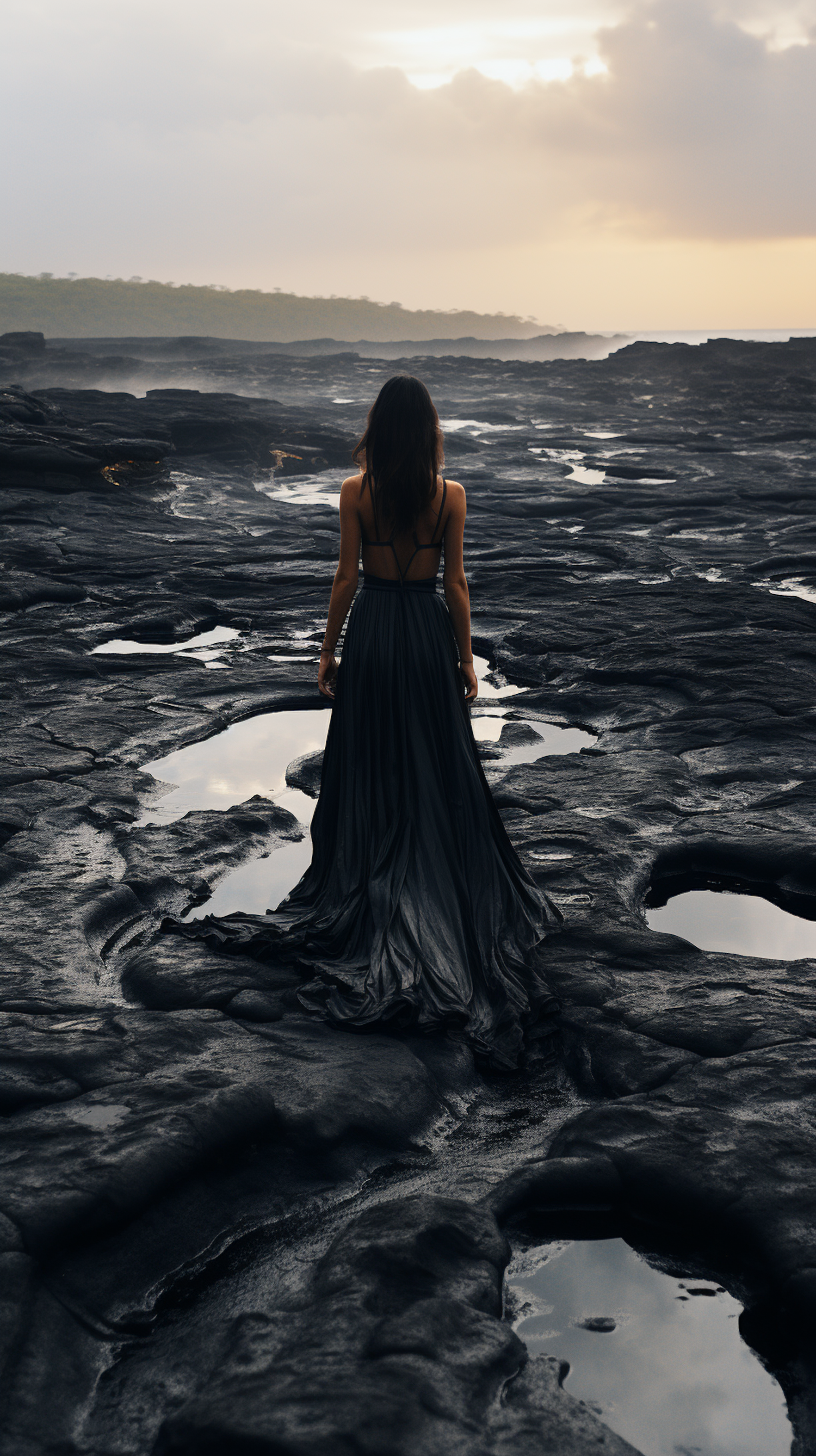 Woman in a flowing dark gown stands on rugged rocks, with misty horizon and puddles reflecting the cloudy sky.
