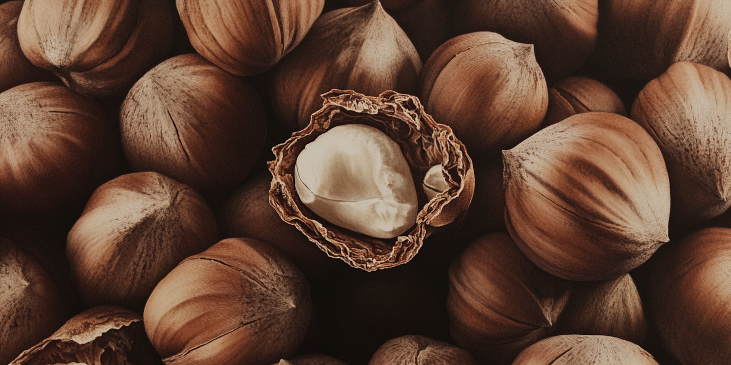 Close-up of hazelnuts with one cracked open, revealing its creamy kernel. Warm tones and textures create a natural, earthy aesthetic.