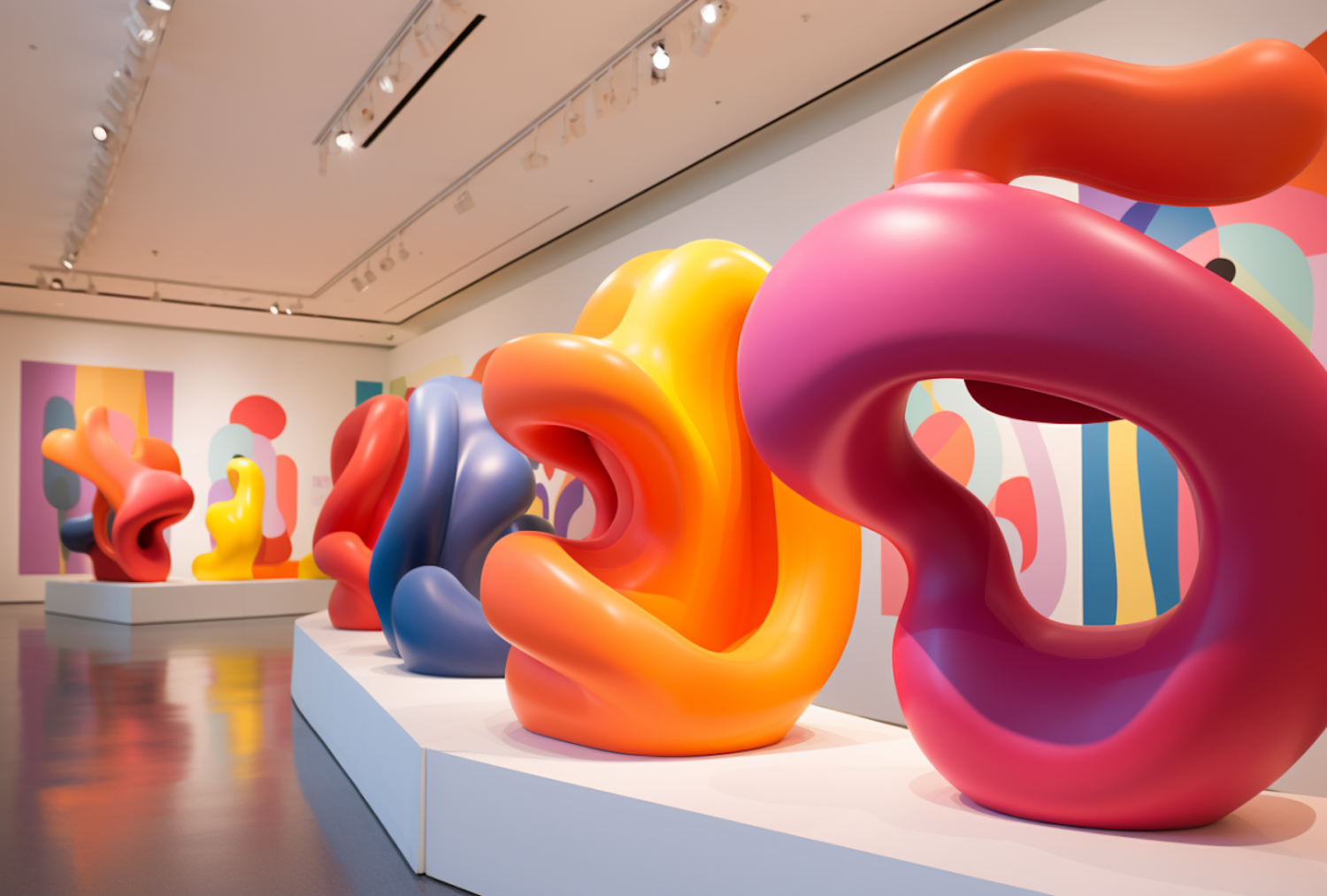 Vibrant abstract sculptures in a modern art gallery, showcasing bold colors and fluid forms on white pedestals with complementary paintings.