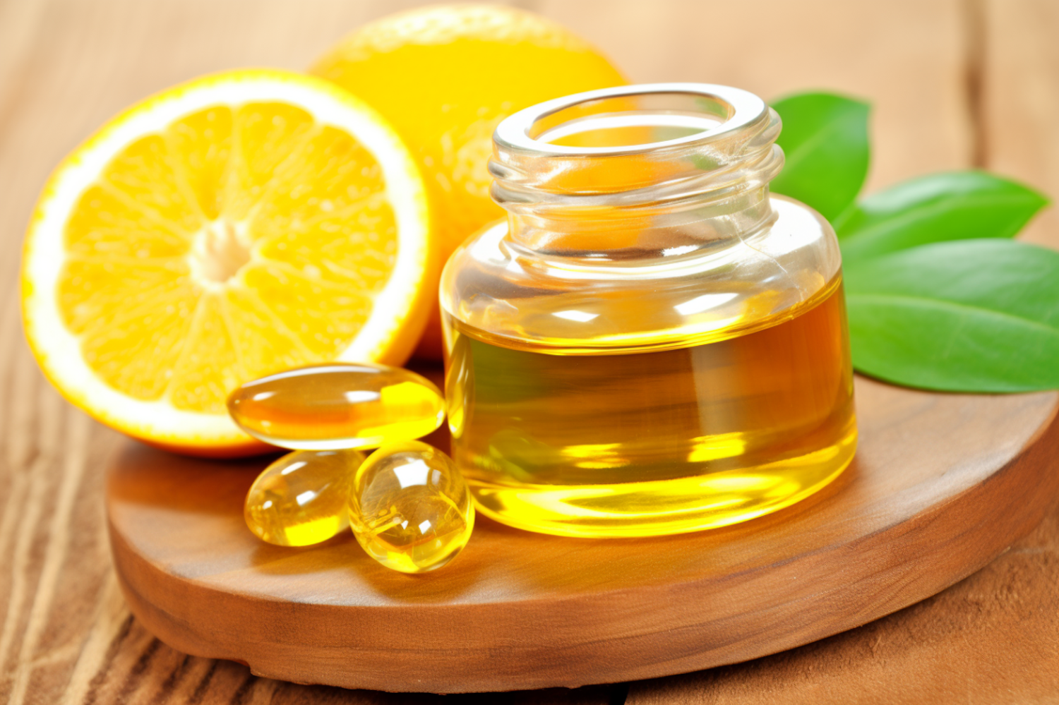 Glass jar with golden liquid, yellow capsules, and fresh oranges on a wooden surface, symbolizing natural health and wellness.