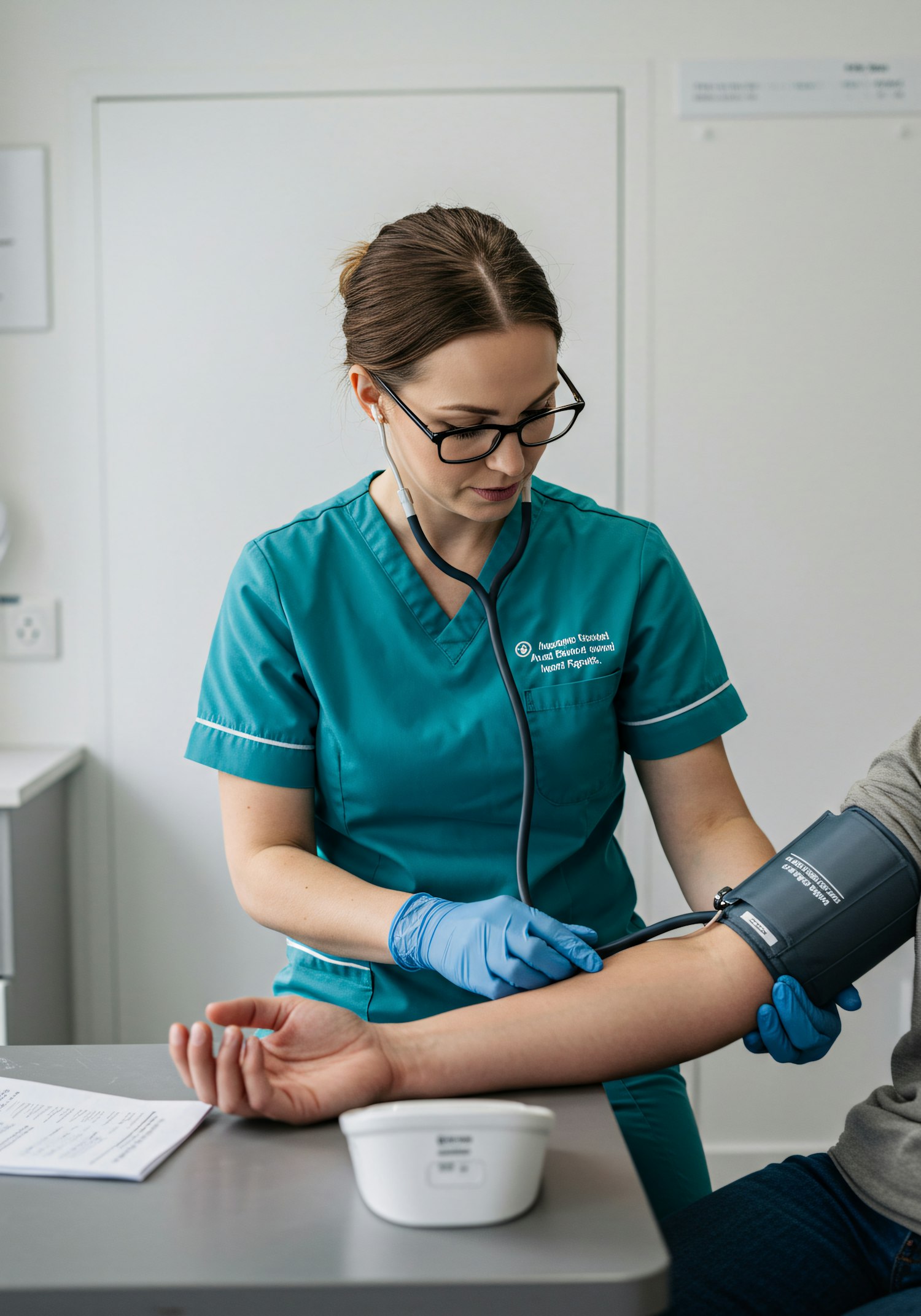A healthcare professional in teal scrubs measures a patient's blood pressure in a clinical setting, showcasing attentive care.