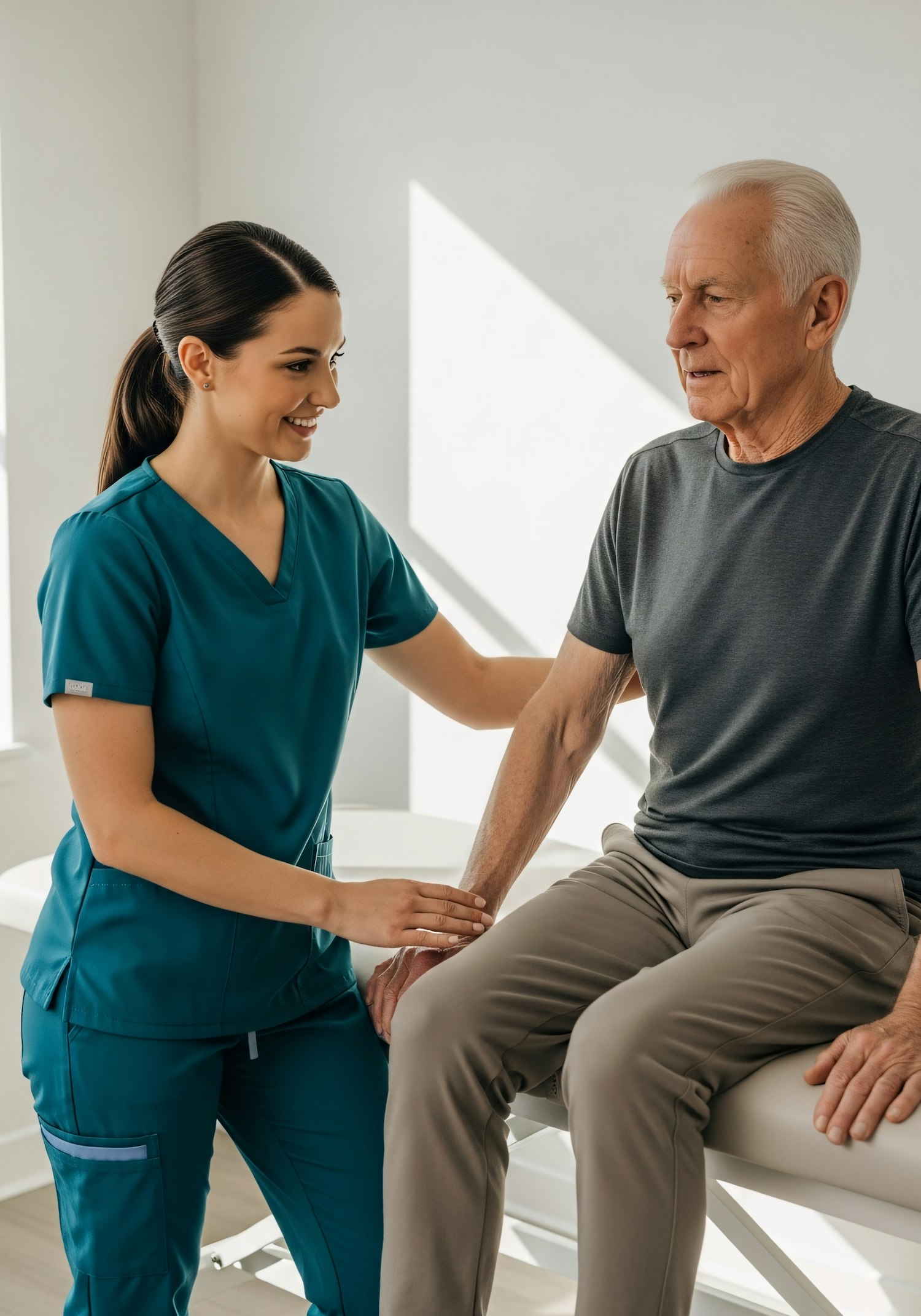 A healthcare worker in teal scrubs assists an elderly man seated on an exam table in a bright medical office.