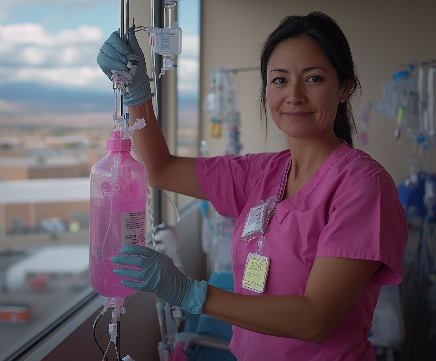 Asian nurse in pink scrubs adjusting a pink IV bag by a hospital window, smiling confidently.