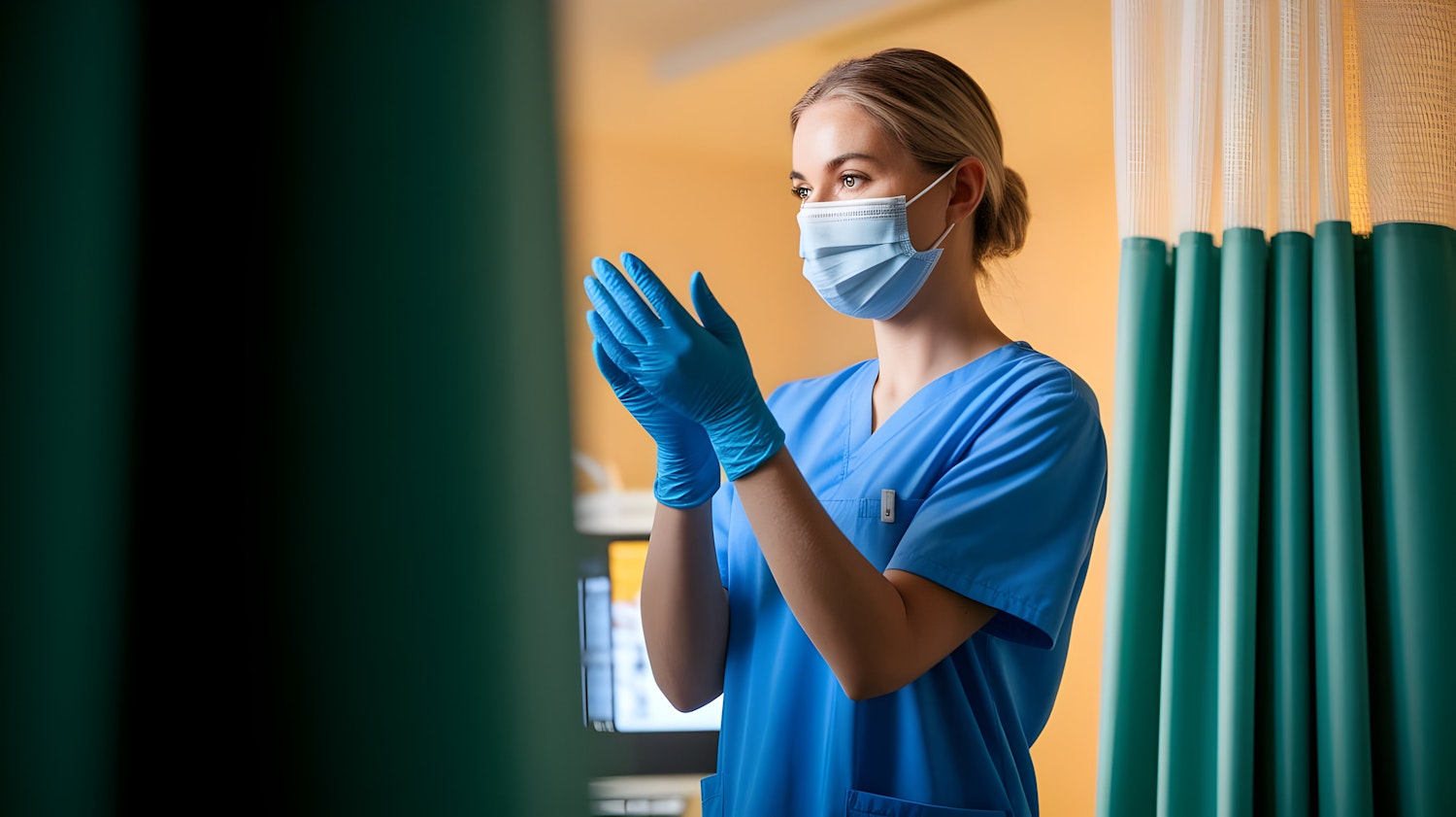 A focused healthcare worker in blue scrubs and gloves prepares in a clinical setting with green curtains and warm lighting.