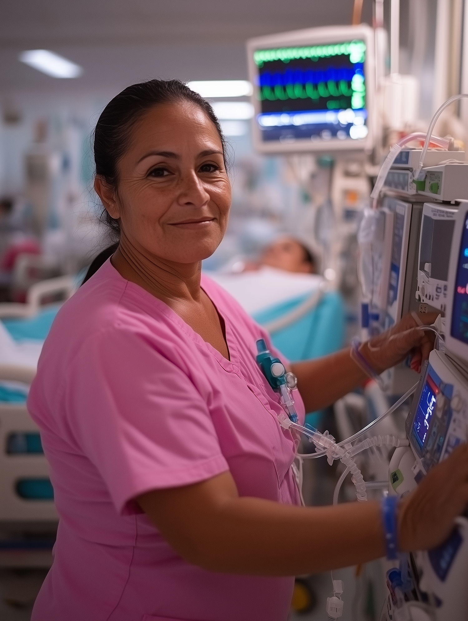Hispanic nurse in pink scrubs adjusts medical equipment in a hospital, exuding calm confidence. Patient and monitors in the background.