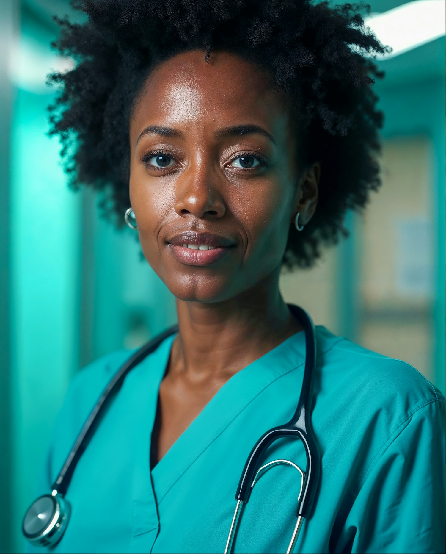Confident Black female healthcare professional in turquoise scrubs with stethoscope, standing in a medical setting.
