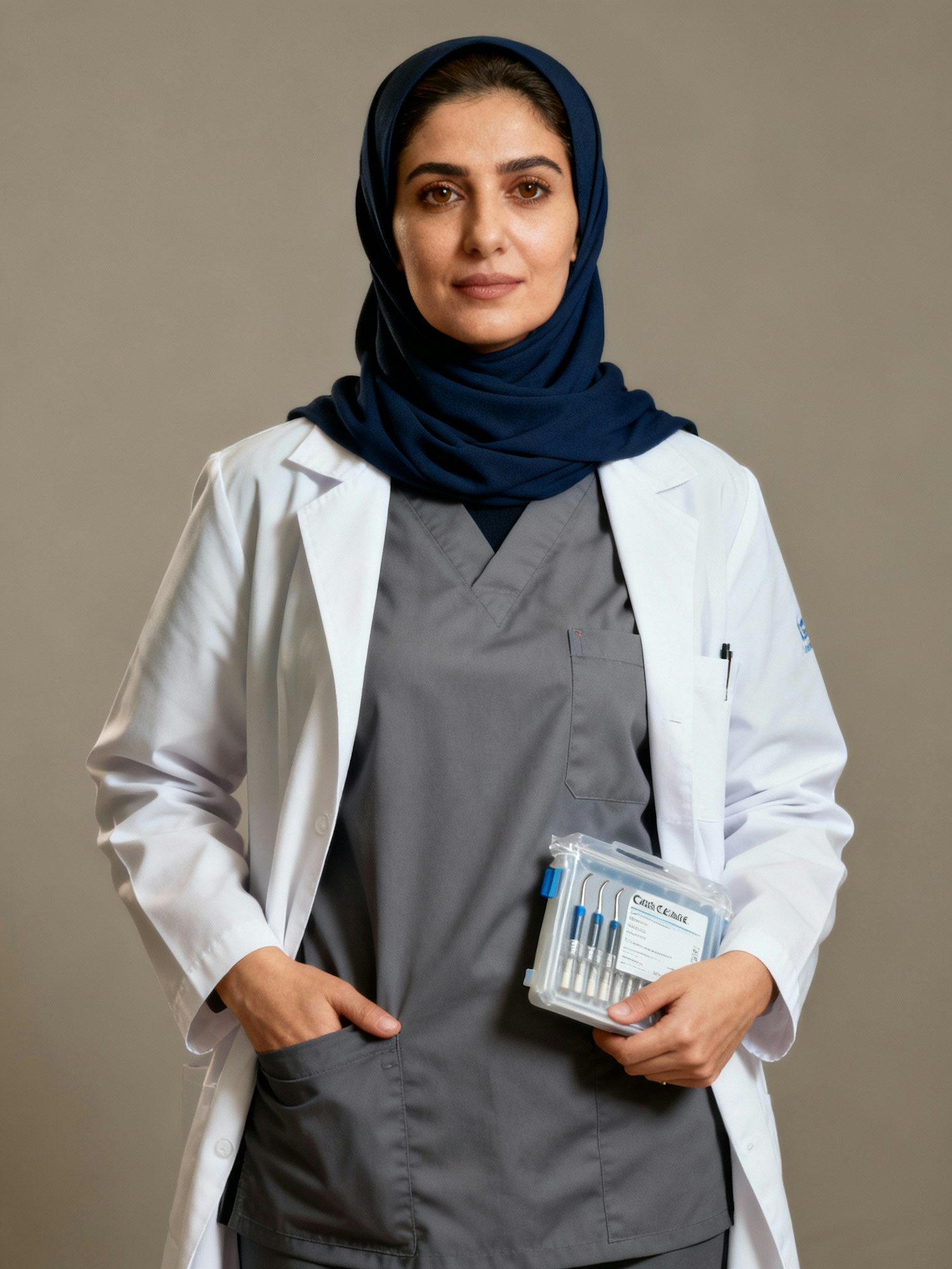 A healthcare professional in a hijab and lab coat holding medical tools, showcasing expertise and professionalism in a neutral setting.