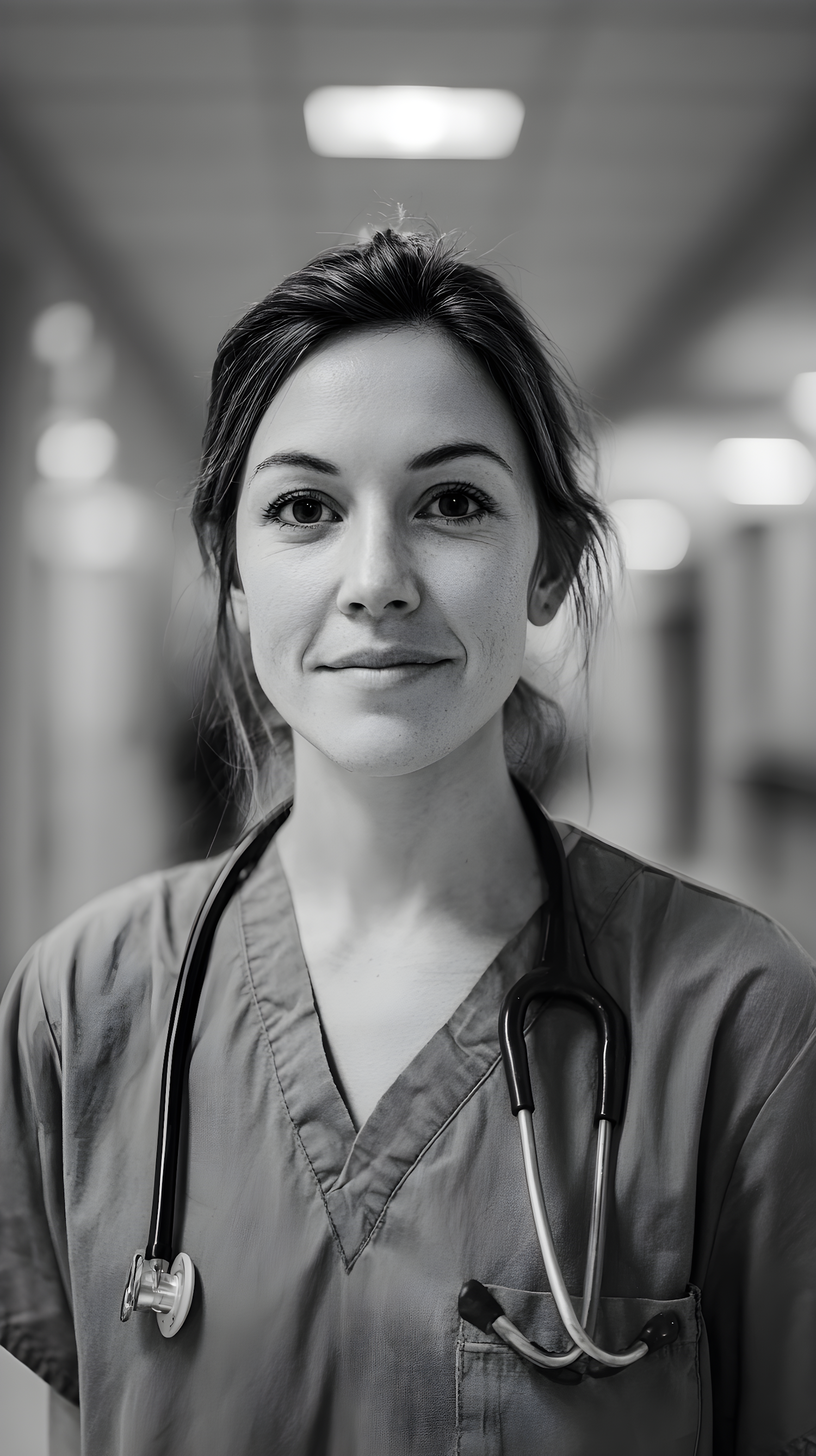Monochrome portrait of a healthcare professional in scrubs with a stethoscope, standing in a softly lit hospital corridor.