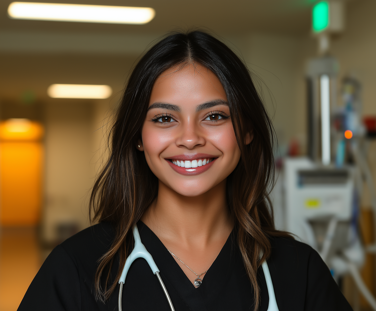 Smiling healthcare professional in black scrubs with stethoscope, standing in a hospital corridor.