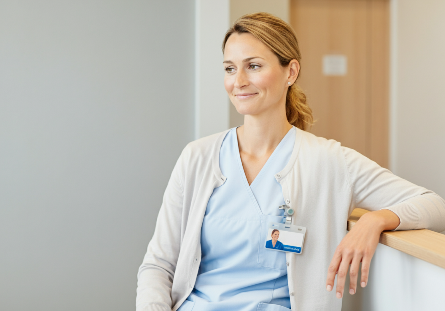 A healthcare professional in light blue scrubs and a white cardigan, smiling softly in a bright, neutral-toned setting.