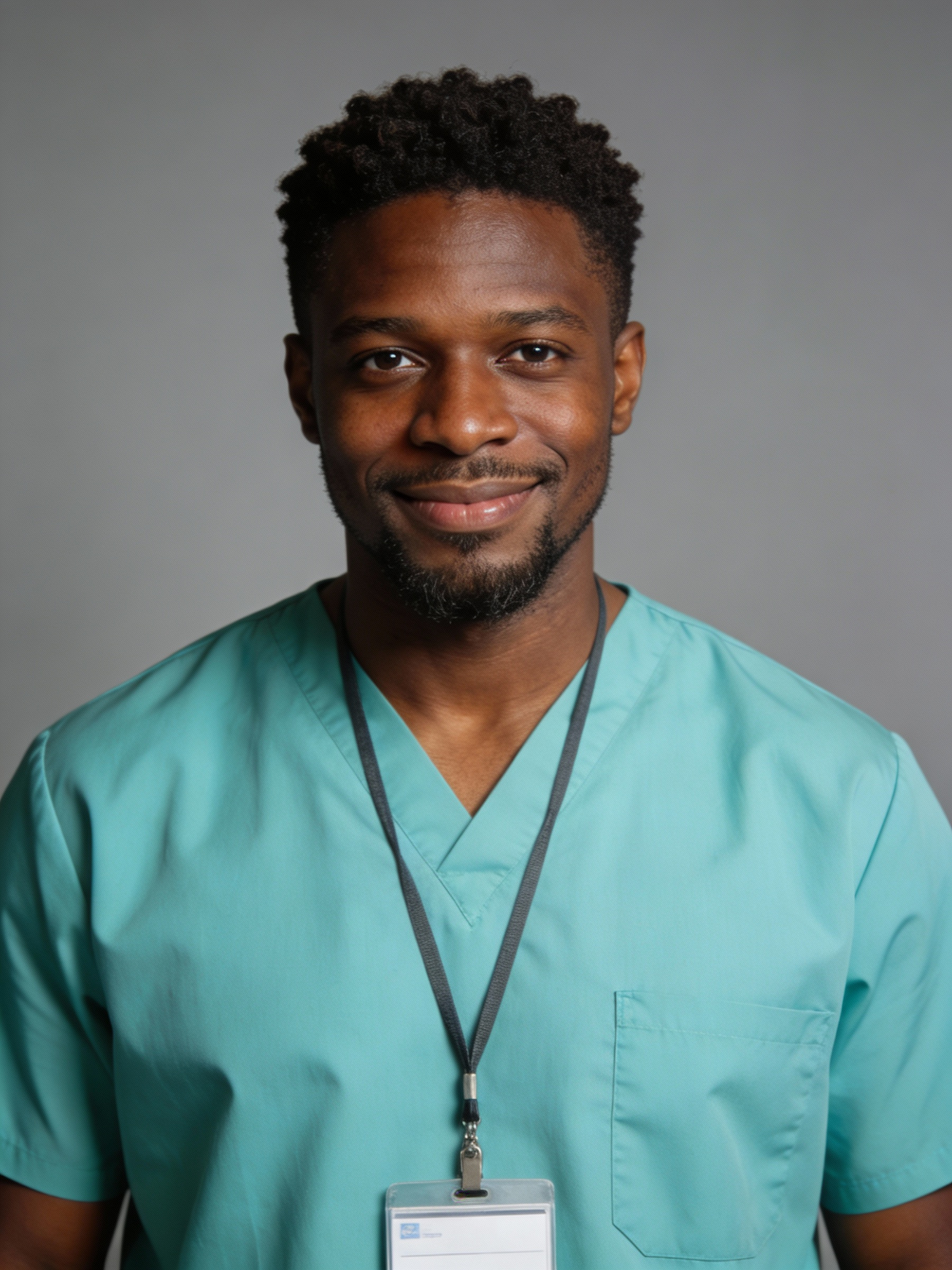 Studio portrait of a Ghanaian male nurse, age 34; deep brown skin, warm undertone; short tightly coiled hair; neatly trimmed goatee; light teal scrub top, simple ID badge on a lanyard (non-branded, generic); neutral mid-gray seamless backdrop; Rembrandt lighting with soft fill; 105 mm macro-sharp. Expression: calm, caring, gentle smile. Framing: portrait orientation, 3:4 ratio; mid-chest-up composition. Subject centered in frame, camera at eye level, facing directly toward the camera (front view). Full head and hair completely inside the frame with a little space above; both shoulders visible, no cropping at the top or sides. Neutral studio composition, no props.
