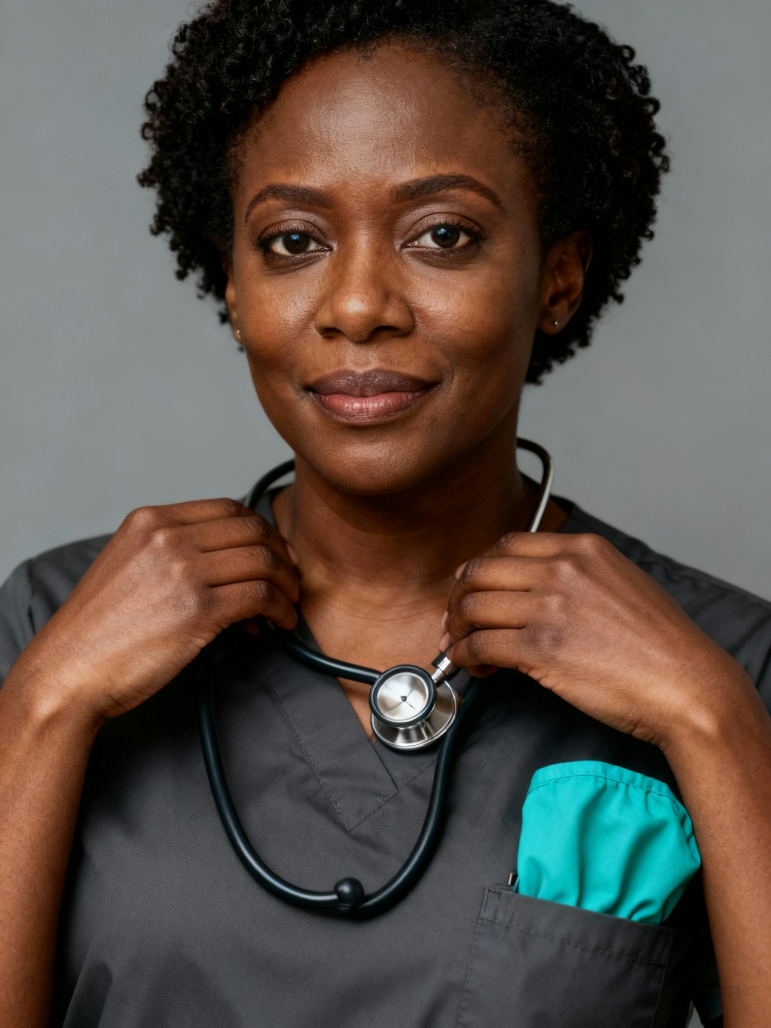 A healthcare professional in gray scrubs with a stethoscope, exuding confidence and professionalism in a neutral setting.