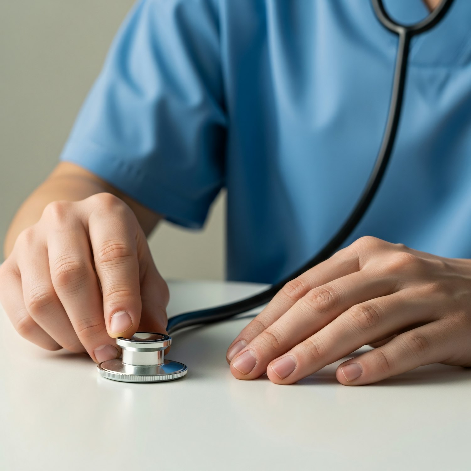 Close-up of a healthcare professional's hands with a stethoscope on a white surface, wearing light blue scrubs in a clean setting.