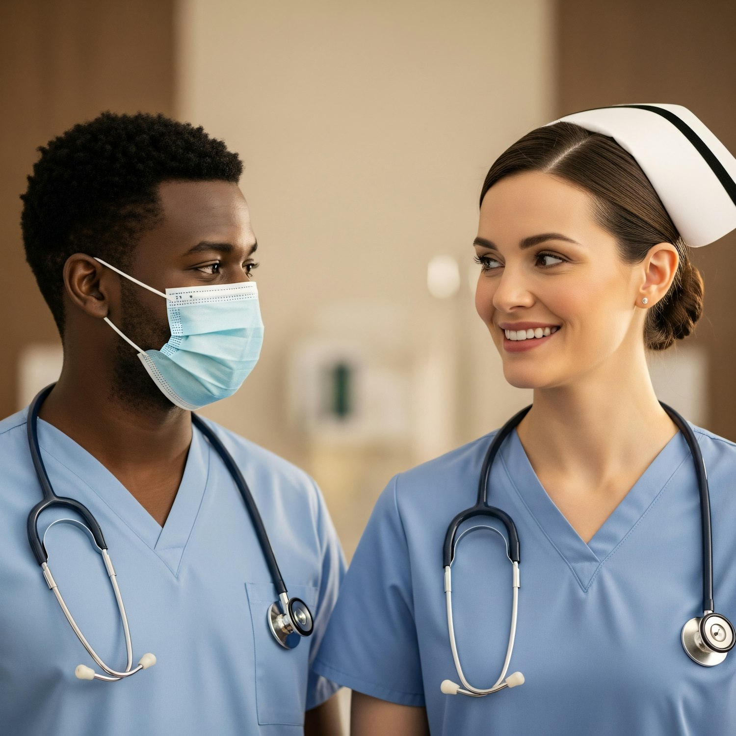 Two healthcare professionals in blue scrubs, one wearing a mask, share a friendly moment in a medical setting.