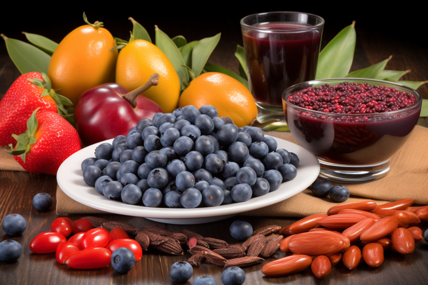 A colorful assortment of fresh fruits and nuts, including blueberries, strawberries, kumquats, and a glass of juice on a wooden table.