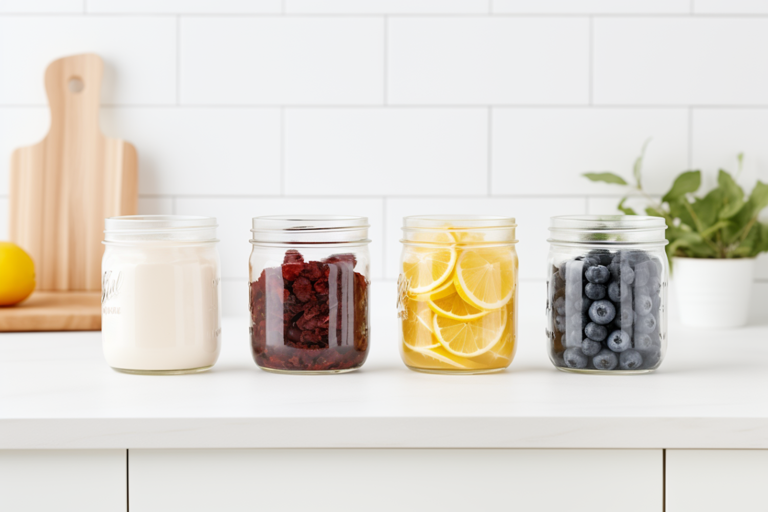 Four jars on a white countertop filled with milk, dried cranberries, lemon slices, and blueberries, creating a vibrant and fresh kitchen scene.