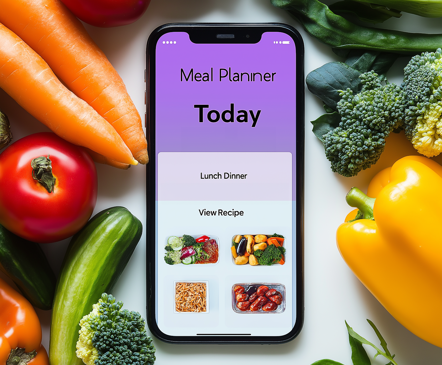 Smartphone with meal planner app surrounded by fresh vegetables, featuring lunch and dinner options with vibrant colors.