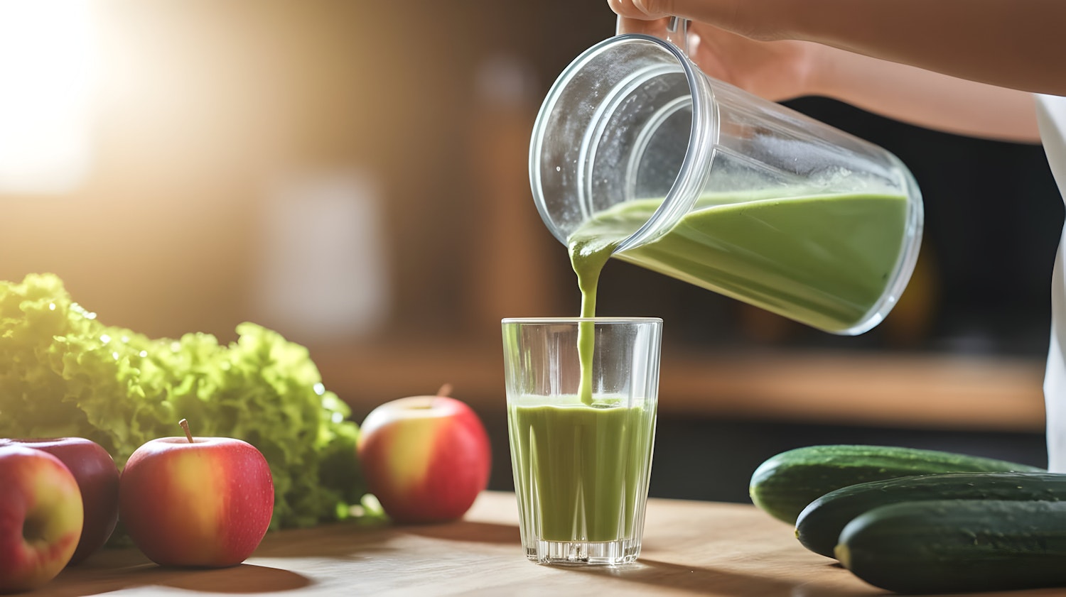 Fresh green smoothie being poured into a glass, surrounded by apples, lettuce, and cucumbers on a sunlit wooden countertop.