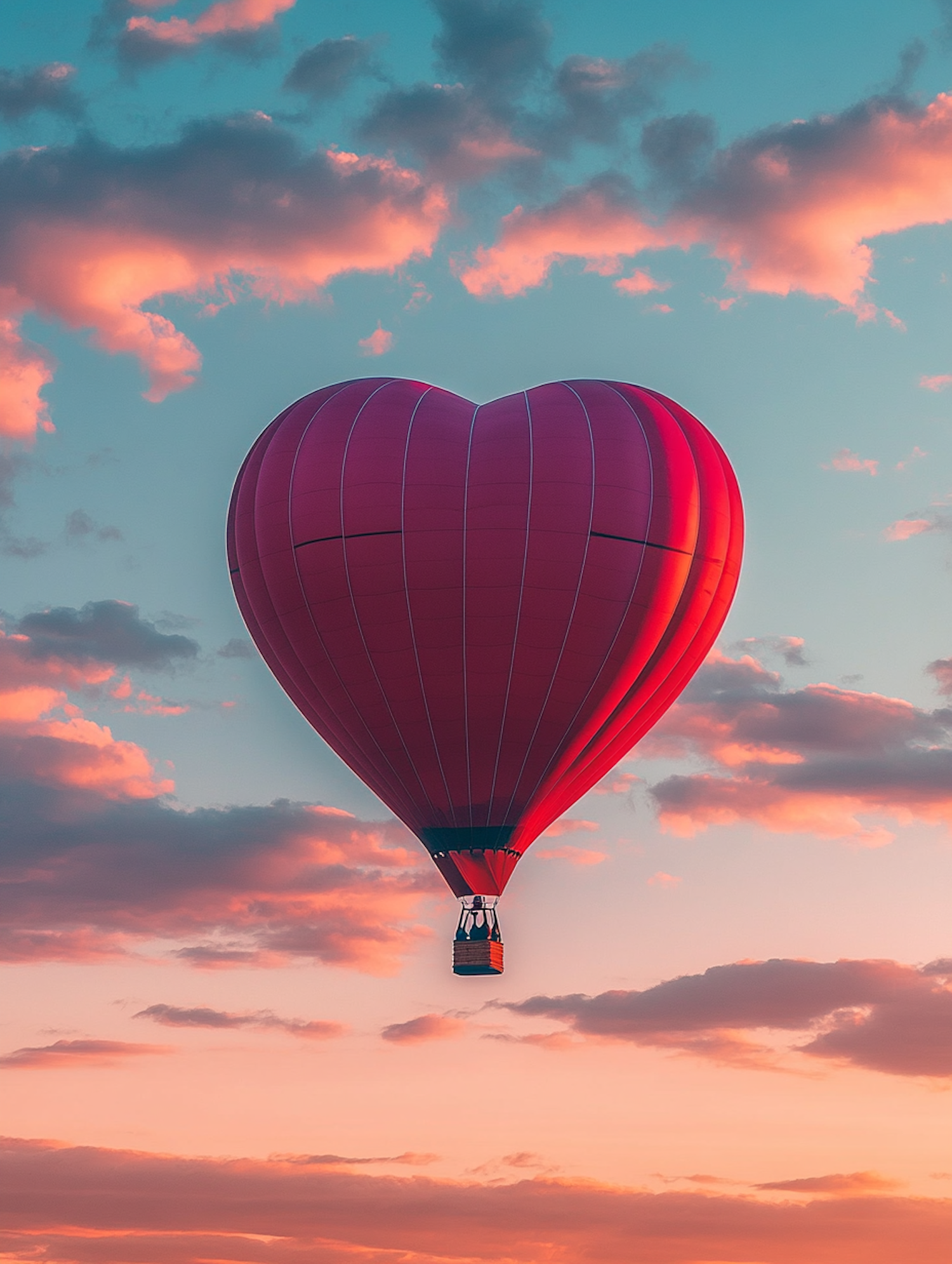 A heart-shaped red hot air balloon floats against a stunning sunset sky with pink and orange clouds, creating a romantic and serene vibe.