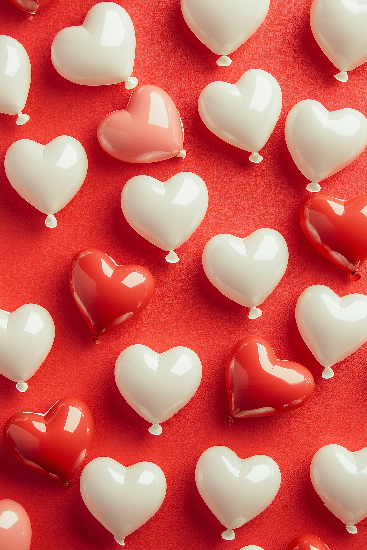Heart-shaped red and white balloons on a bright red background, creating a playful and romantic vibe with glossy textures.