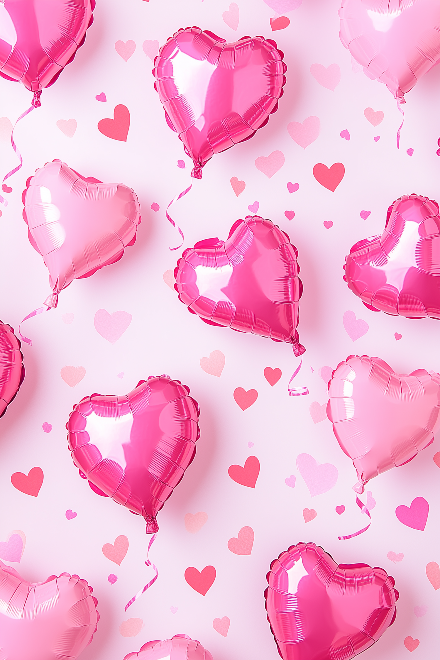 Glossy pink heart-shaped balloons with dangling ribbons float on a soft pink background, surrounded by smaller heart designs.