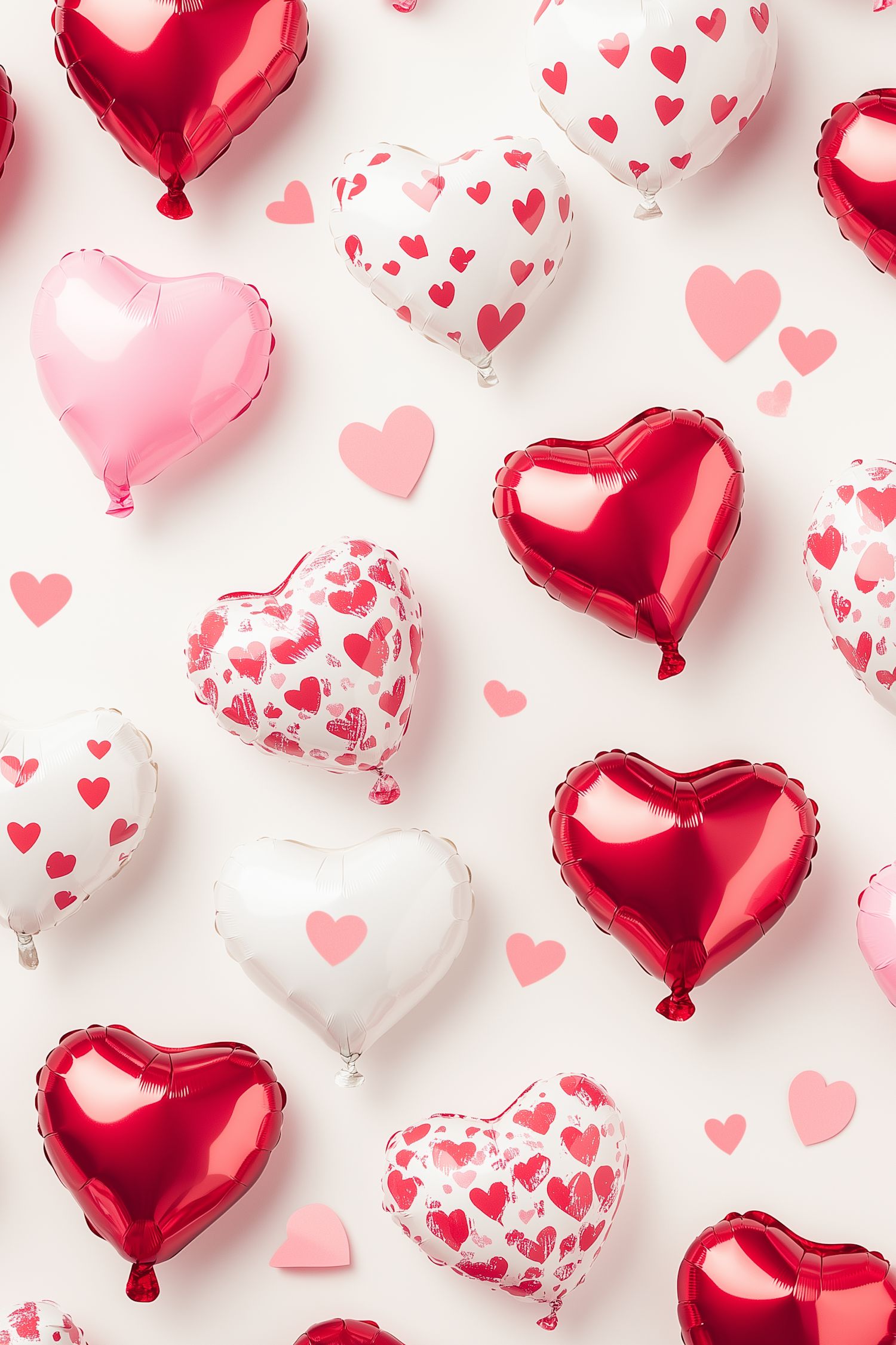 Heart-shaped balloons in red, pink, and white with heart patterns on a cream background, creating a festive and romantic vibe.
