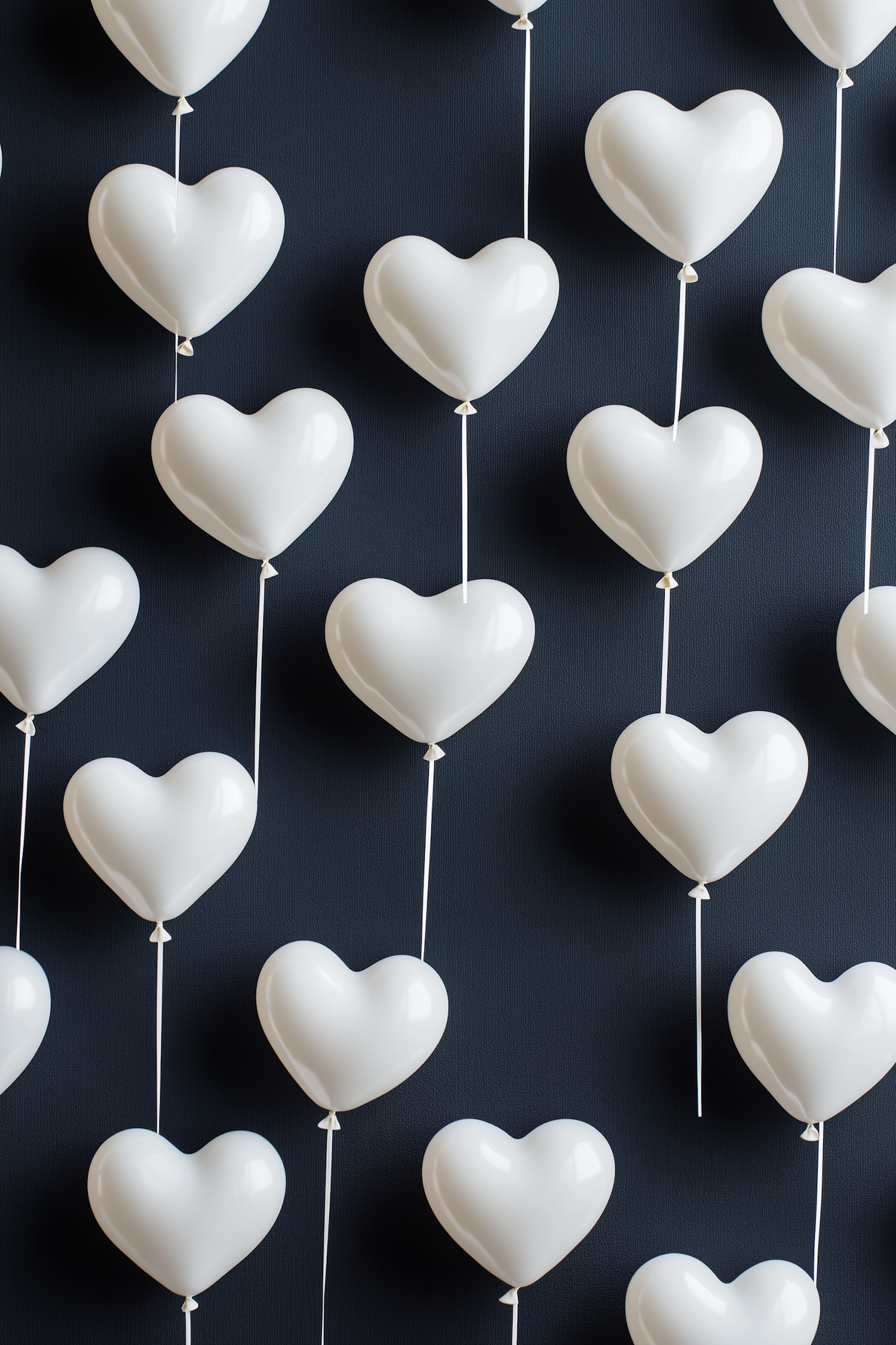 White heart-shaped balloons on strings against a dark background, creating a romantic and elegant visual contrast.
