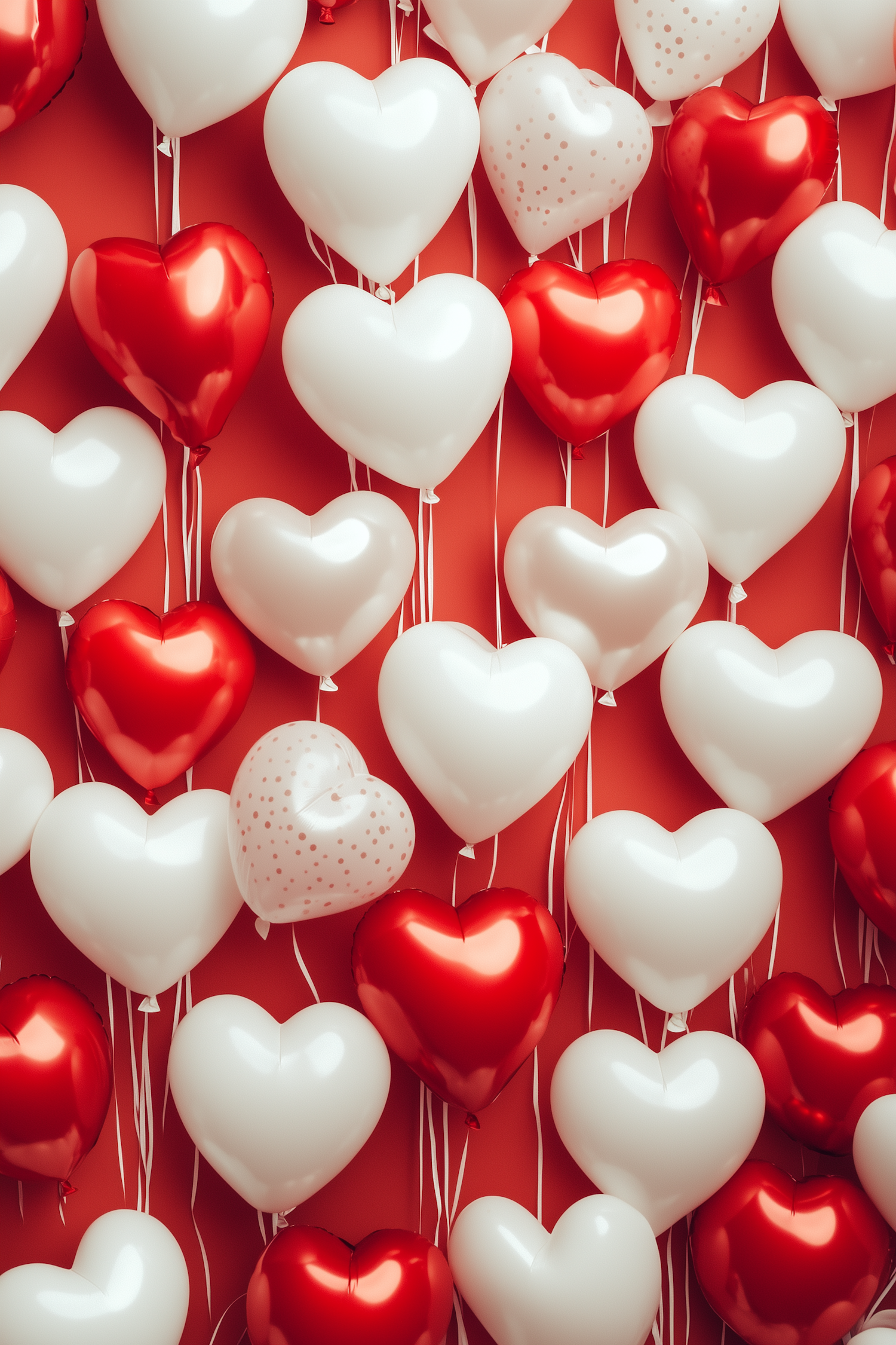 Heart-shaped red and white balloons with polka dots on a red background, perfect for Valentine's Day or romantic celebrations.