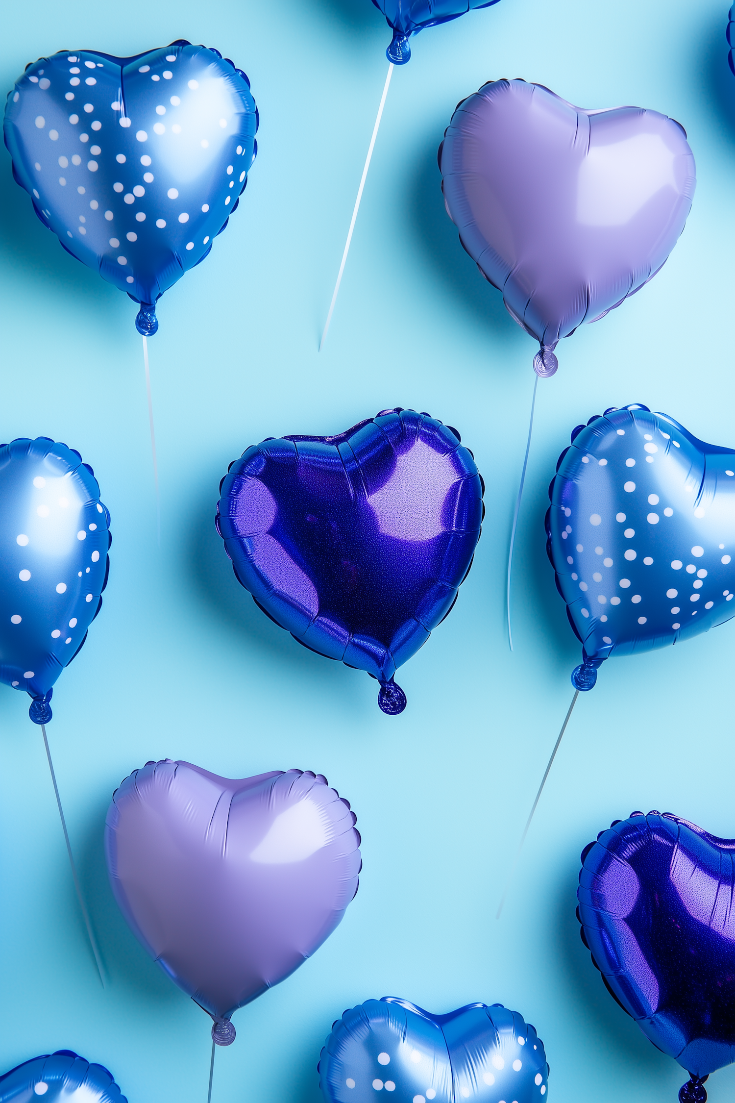 Heart-shaped blue and purple metallic balloons with polka dots on a light blue background, creating a playful and festive vibe.