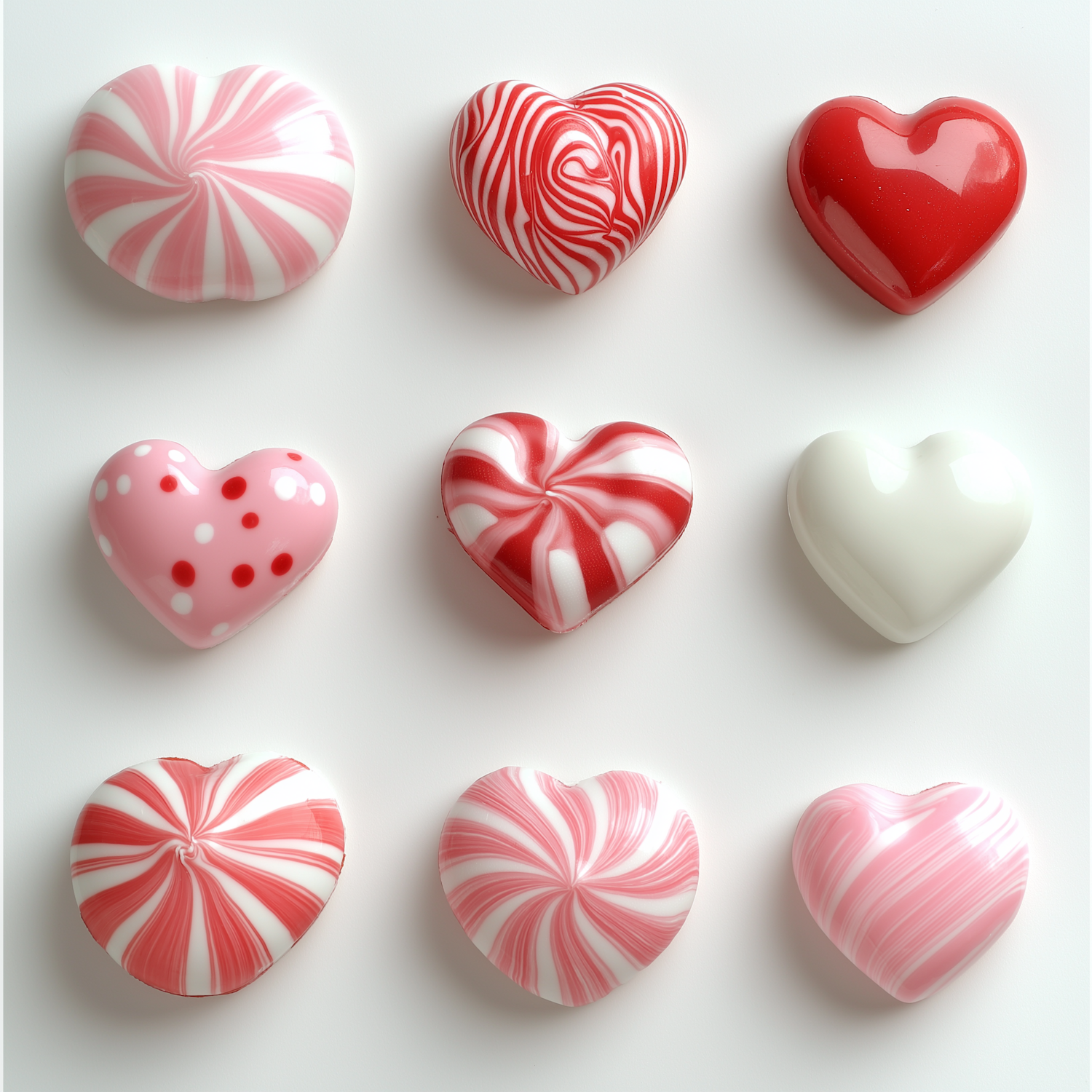 Nine glossy heart-shaped candies in red, pink, and white with swirls, stripes, and polka dots, arranged on a white background.