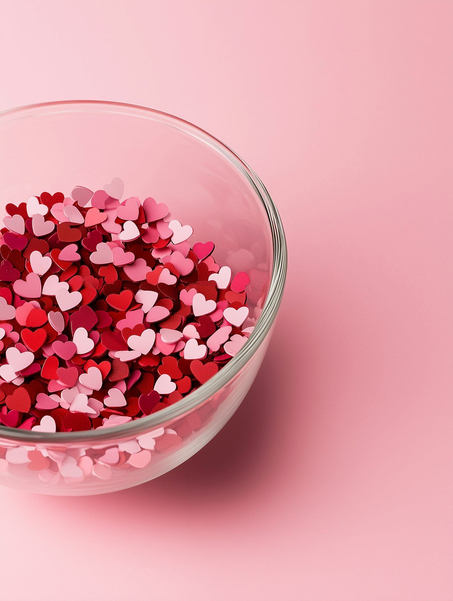 Glass bowl filled with vibrant heart-shaped confetti in red, pink, and white on a light pink background. Perfect for romantic themes.