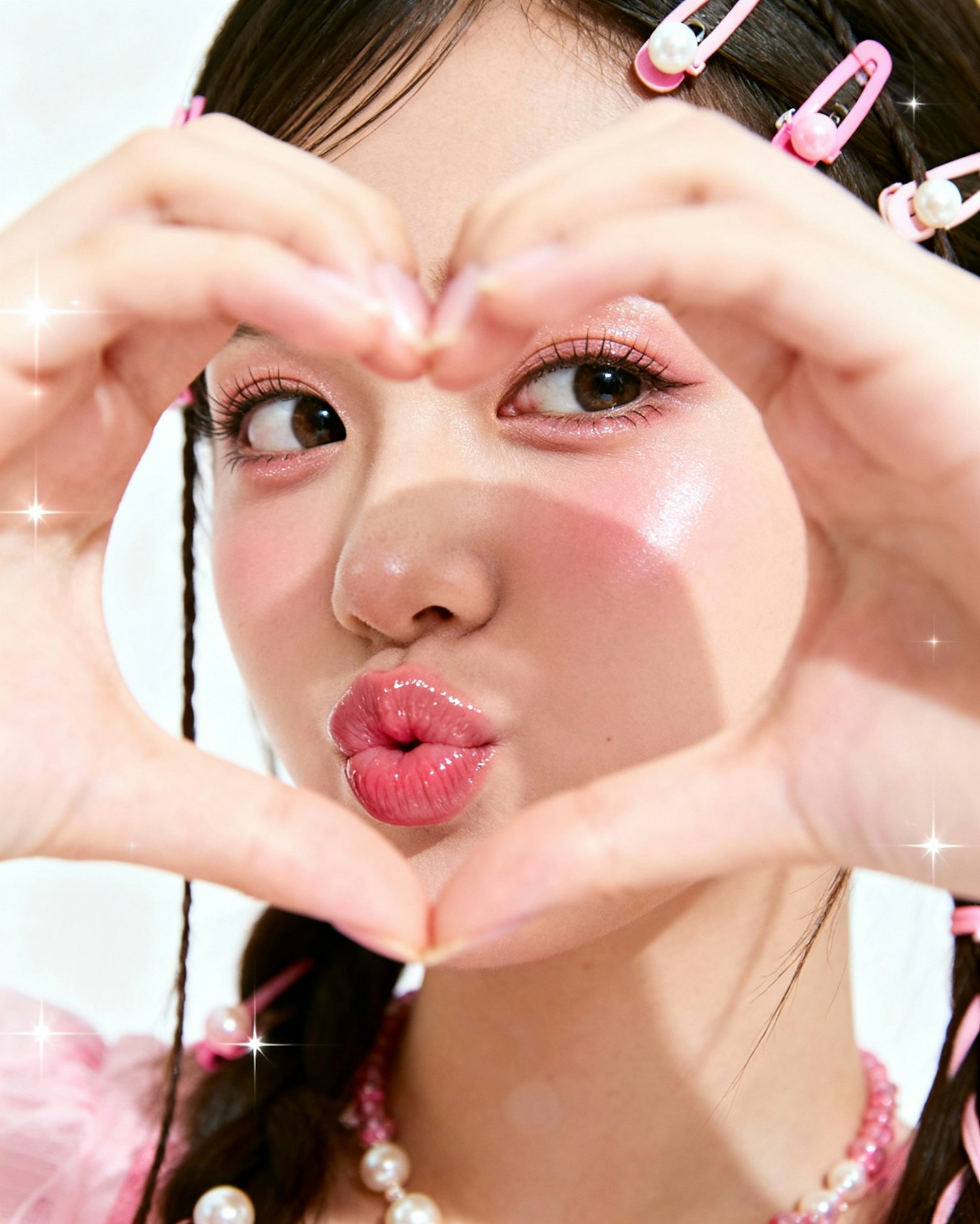 Editorial close-up of a girl forming a heart with her fingers in front of her face. Her lips are puckered and glossy, and her eyes are looking sideways playfully. She wears subtle makeup with glassy skin, pink and pearl accessories, and mini pastel hair clips. The background is clean white, emphasizing the playful expression and fresh Y2K aesthetic. Add sparkle filters and slight blur around the edges to mimic early 2000s Japanese teen magazine ads.