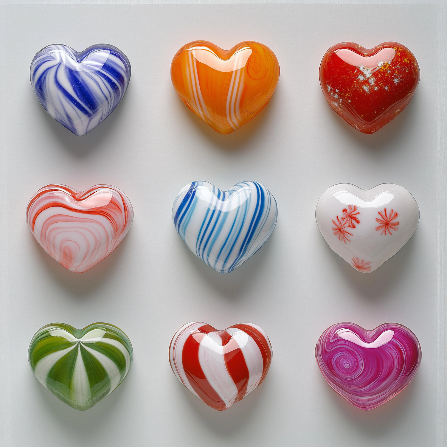 Nine colorful glass heart ornaments with unique patterns, including swirls, stripes, and floral designs, arranged on a white background.