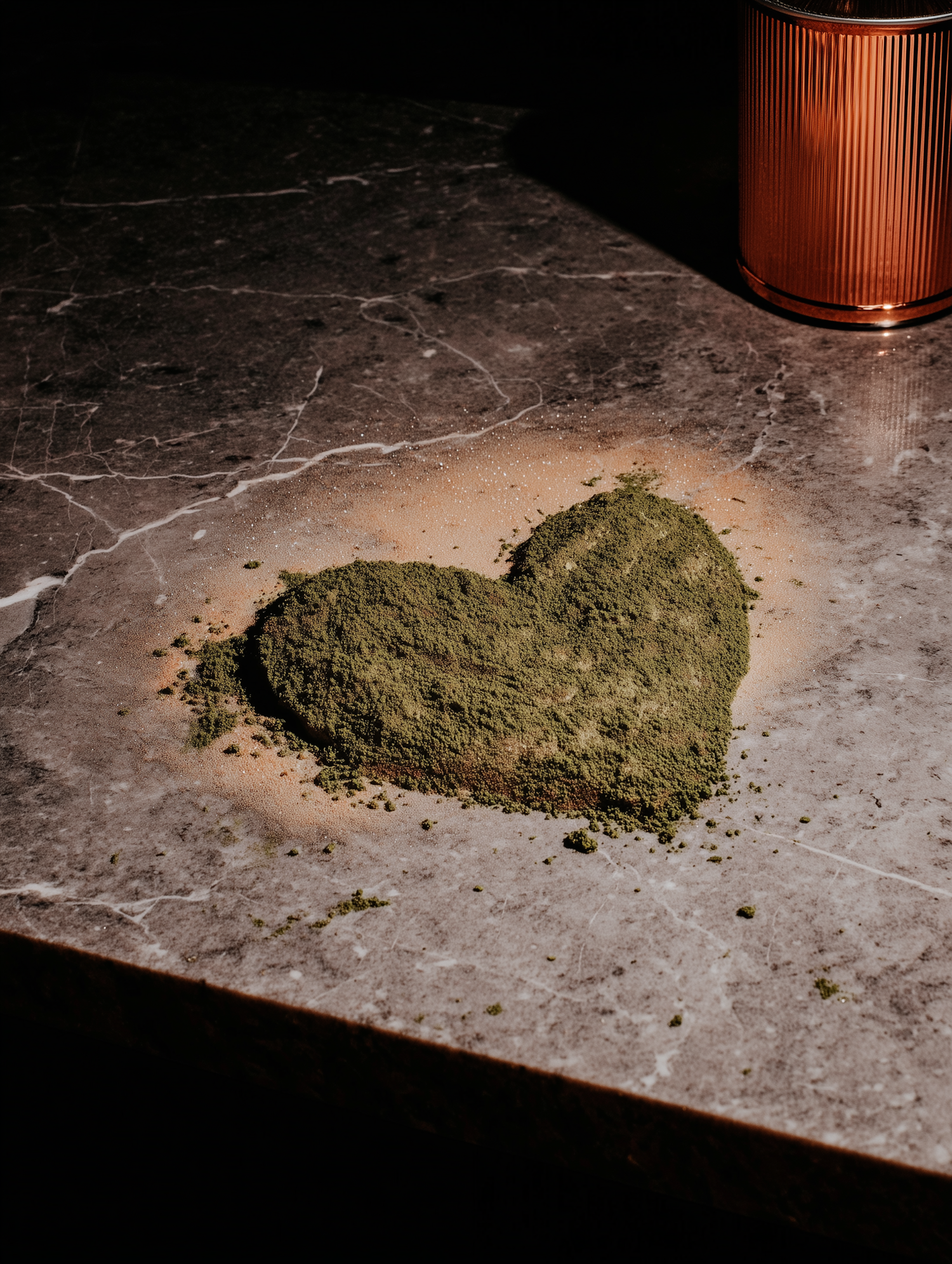 Heart-shaped green powder on a marble surface with a copper container, showcasing a minimalist and textured aesthetic.