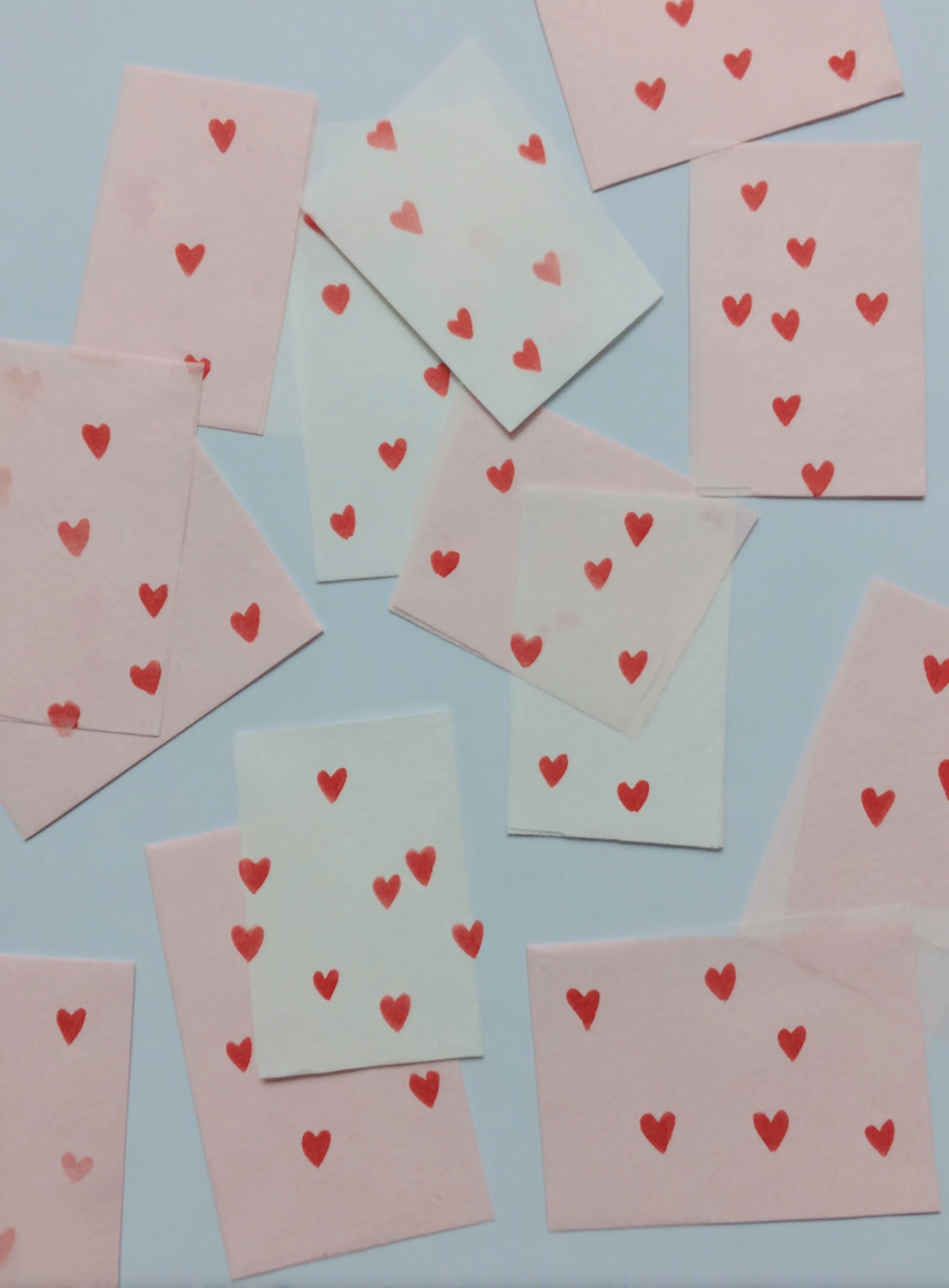 A scattered arrangement of pink and white papers with red heart patterns on a light background, creating a charming and romantic aesthetic.