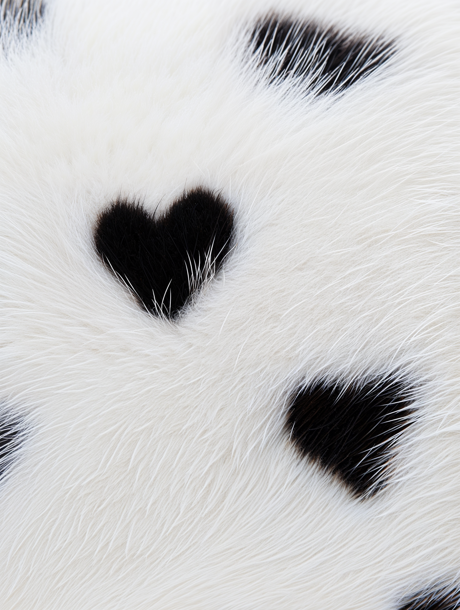 Close-up of soft white fur with black heart-shaped patterns, showcasing a unique and adorable natural design.