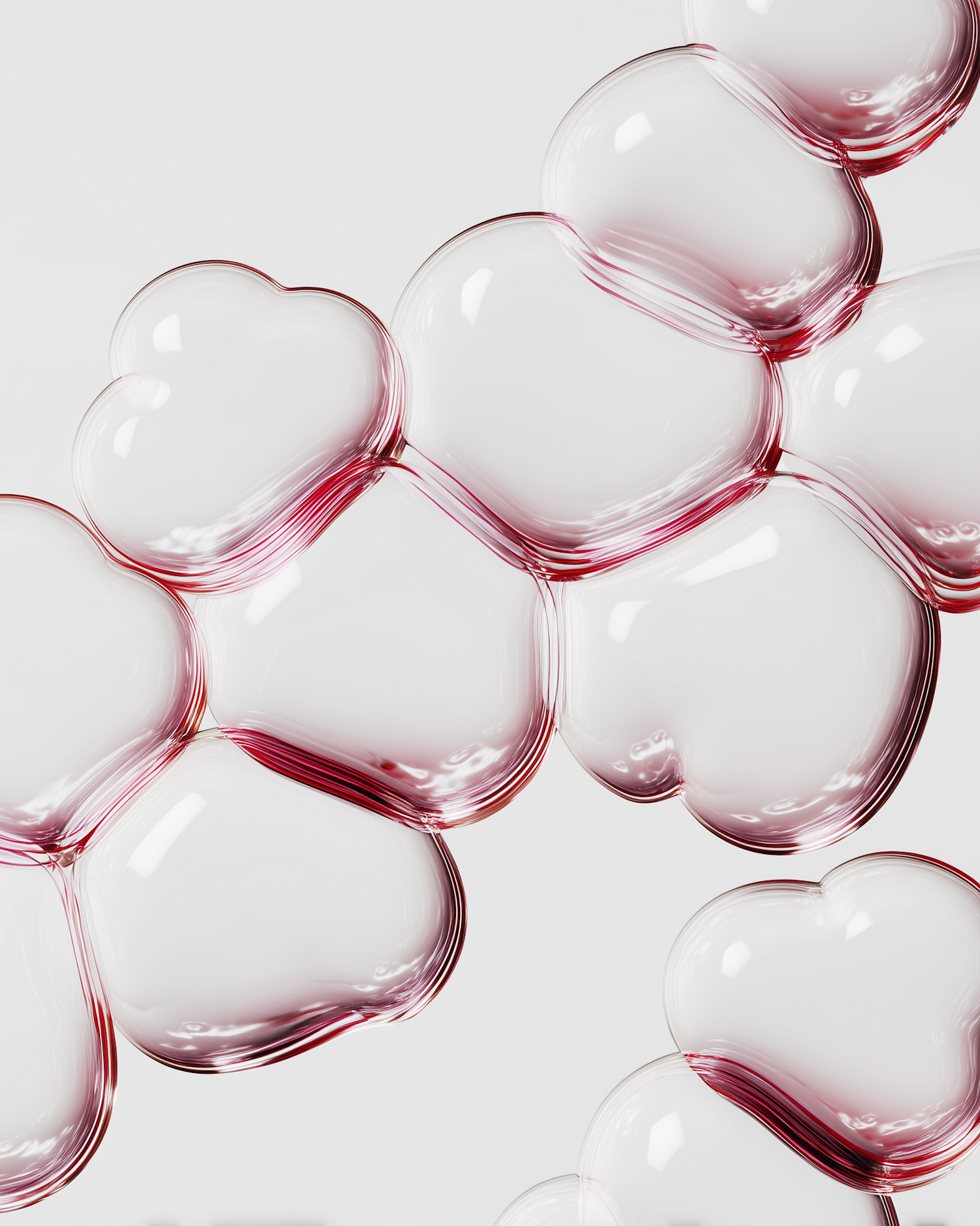 A close-up of translucent heart-shaped bubbles with red accents, interconnected against a white background, creating a modern artistic look.