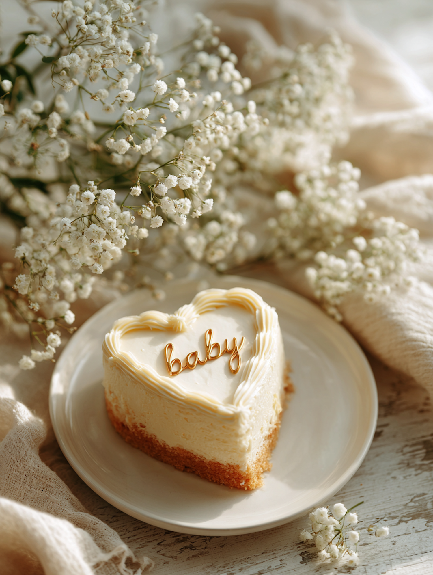 Heart-shaped cake with 'baby' decoration, surrounded by baby's breath flowers on a rustic white table.