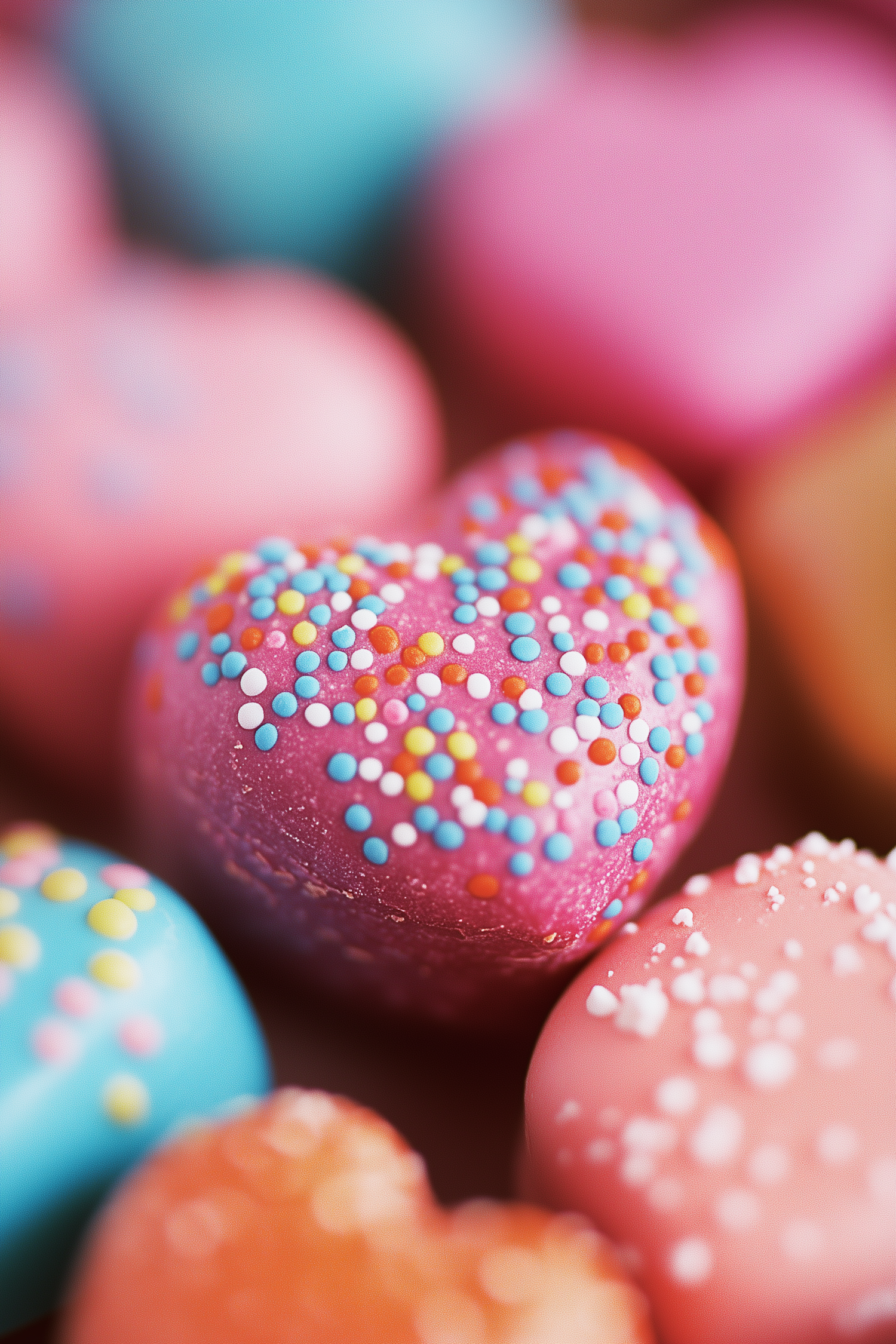 Close-up of colorful heart-shaped candies with sprinkles, featuring vibrant pink, blue, and orange hues.