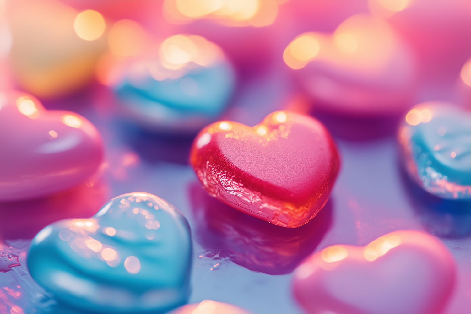 Vibrant heart-shaped candies in pink, blue, and red on a reflective surface with warm, dreamy lighting and bokeh effects.