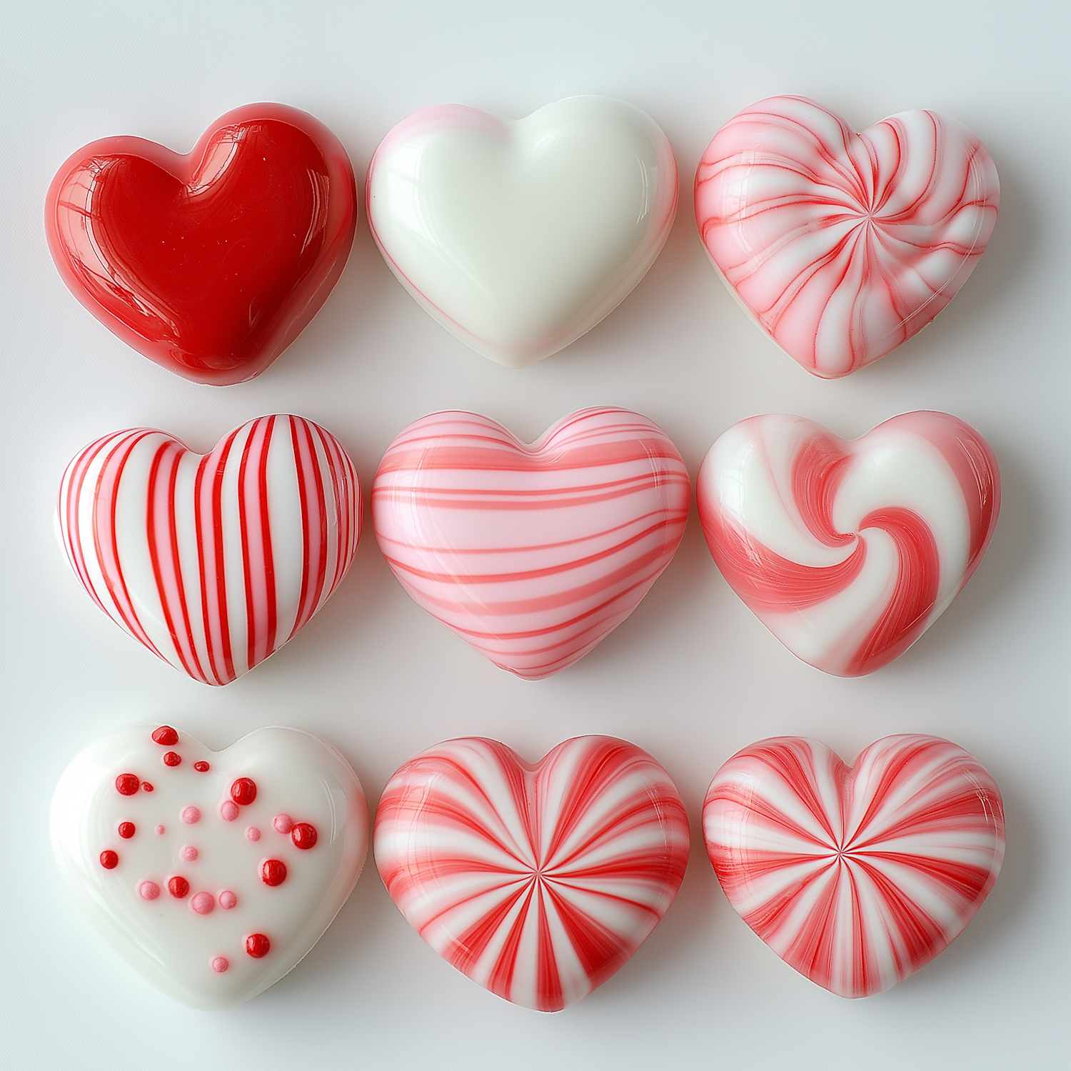 Nine glossy heart-shaped candies in red, white, and pink designs, arranged in a grid. Perfect for Valentine's Day or sweet-themed decor.