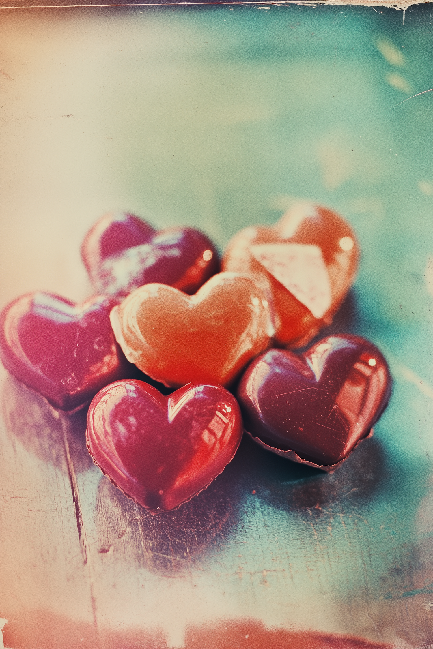 Heart-shaped candies in red and orange on a textured teal surface, creating a warm and nostalgic atmosphere.