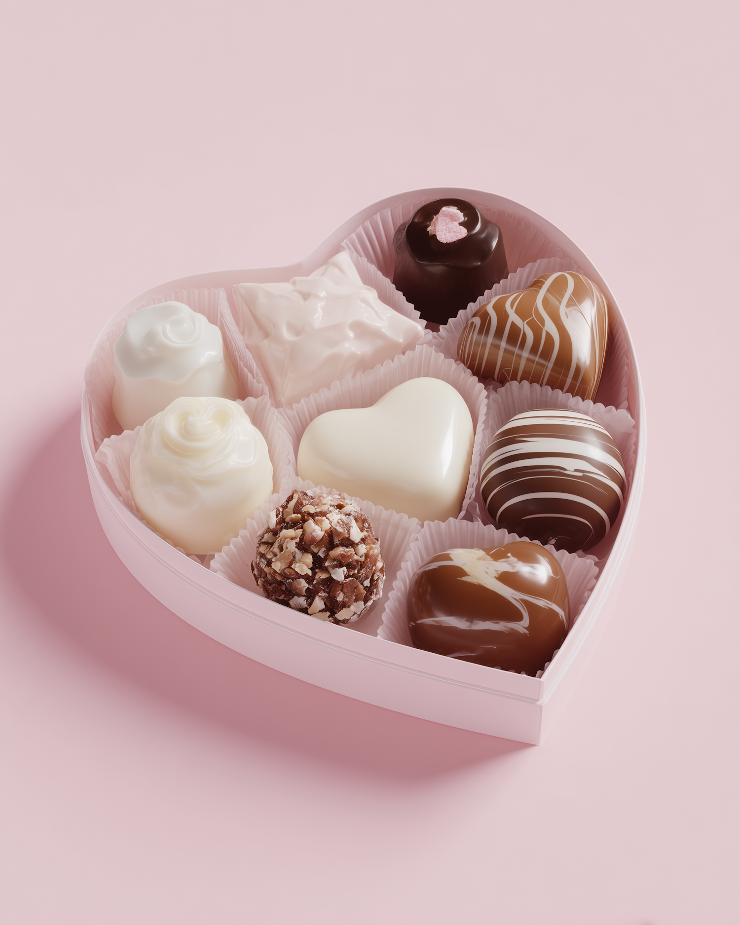 A heart-shaped box of assorted chocolates on a pink background, featuring various designs and toppings, perfect for gifting or indulging.
