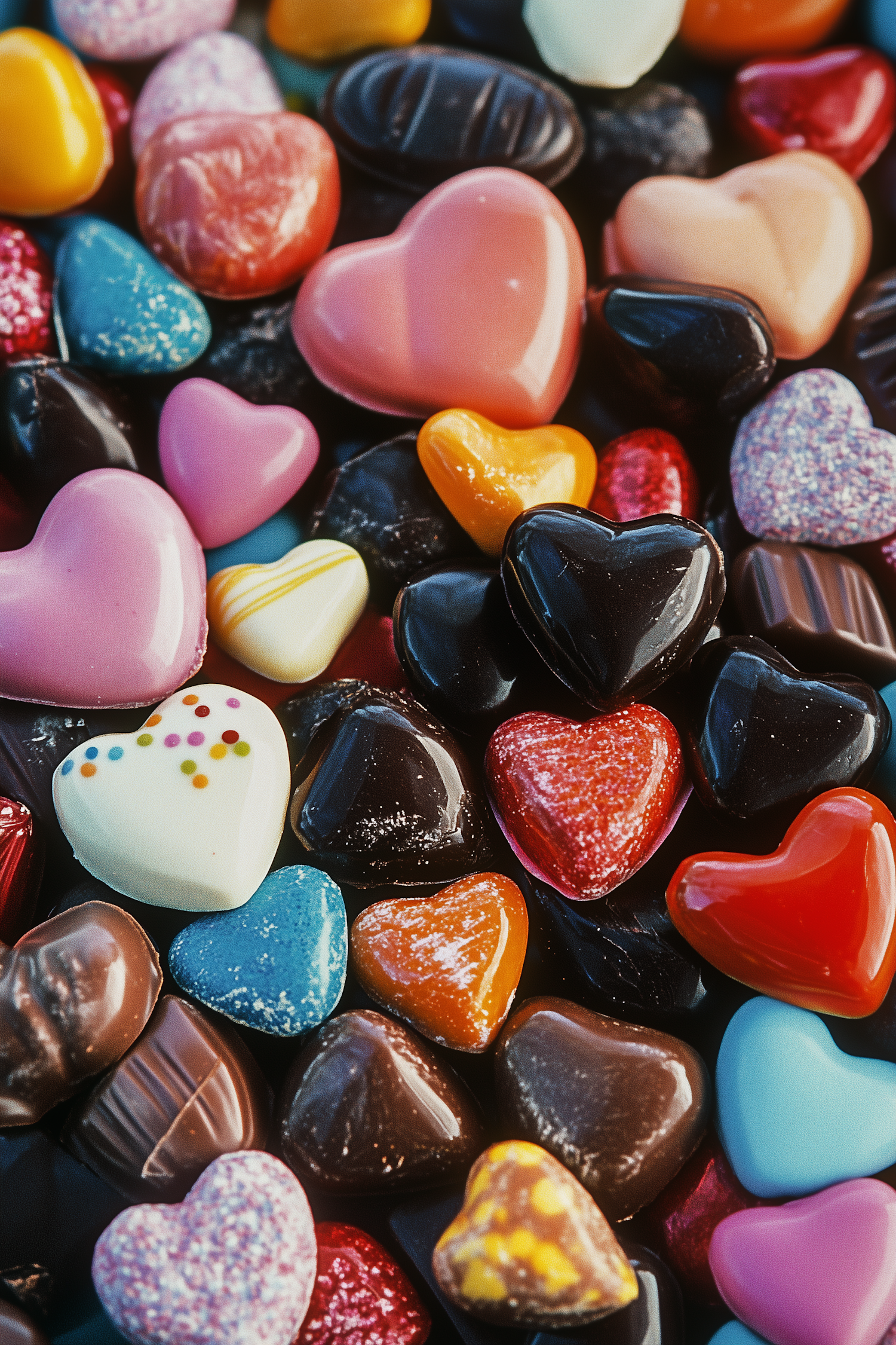 Colorful heart-shaped chocolates and candies in various hues and patterns, creating a vibrant and sweet mosaic.