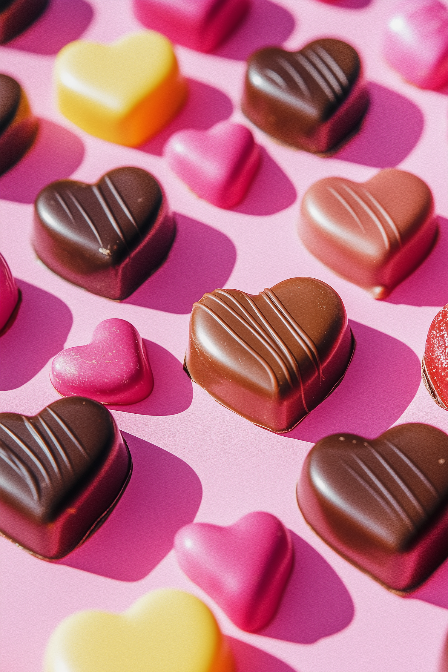 Heart-shaped chocolates and candies on a pink background, featuring vibrant colors and glossy textures.