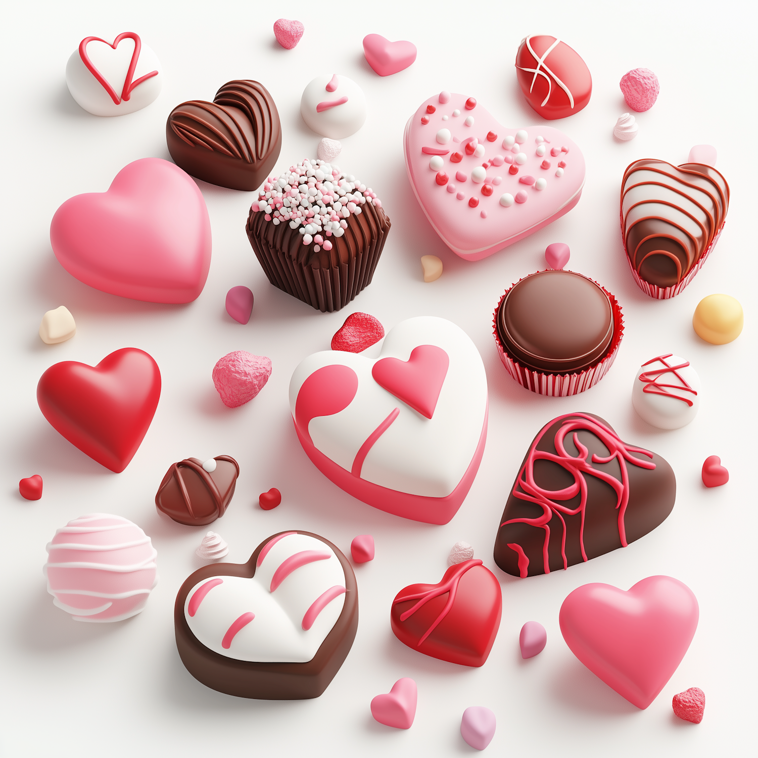 Heart-shaped chocolates and candies in pink, red, and white, beautifully arranged on a white background, perfect for Valentine's Day.