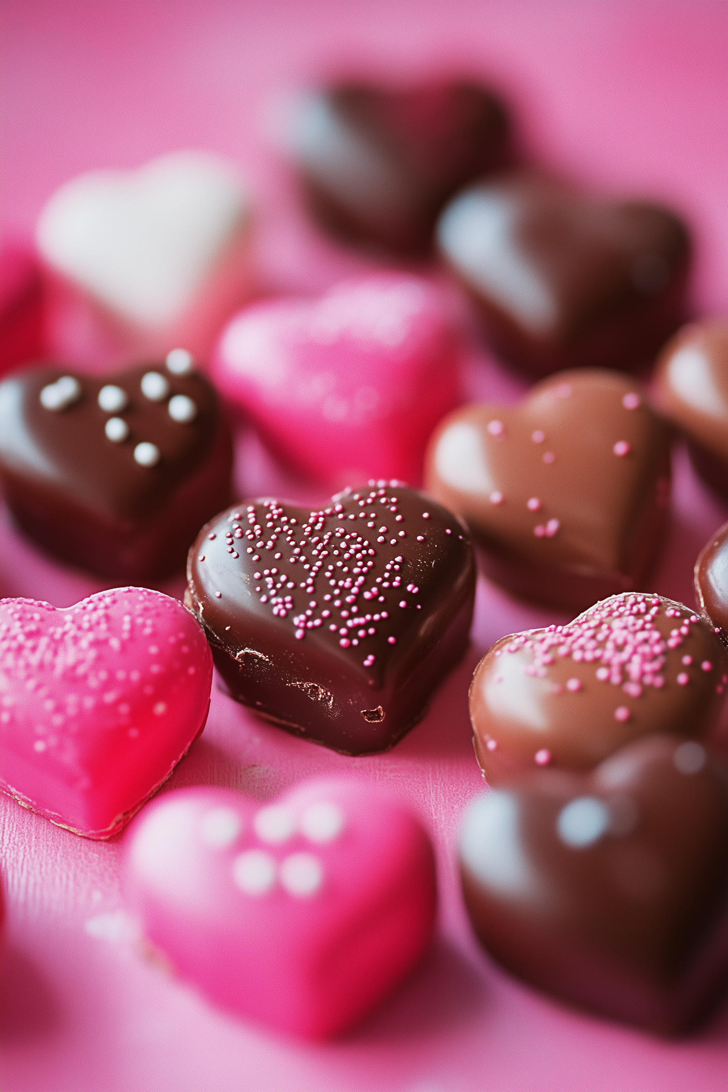 Heart-shaped chocolates and candies with sprinkles on a pink background, creating a sweet and romantic vibe.