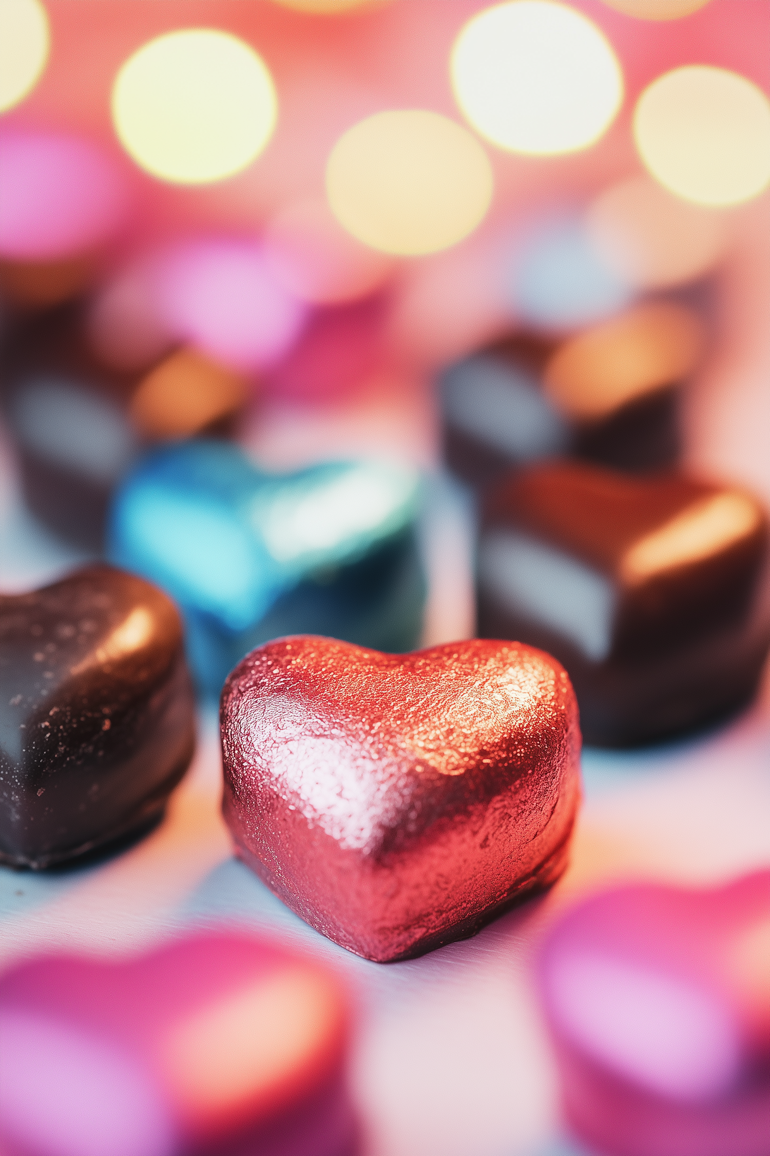 Heart-shaped chocolates in colorful foil with warm bokeh lights, creating a romantic and festive atmosphere.