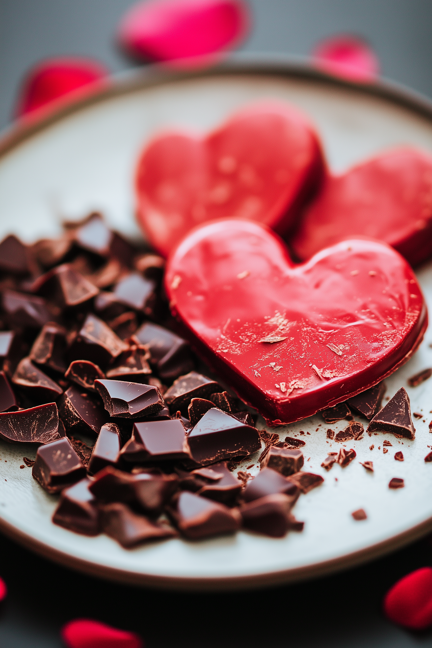 Red heart-shaped chocolates and dark chocolate chunks on a plate, set against a romantic background with hints of red.